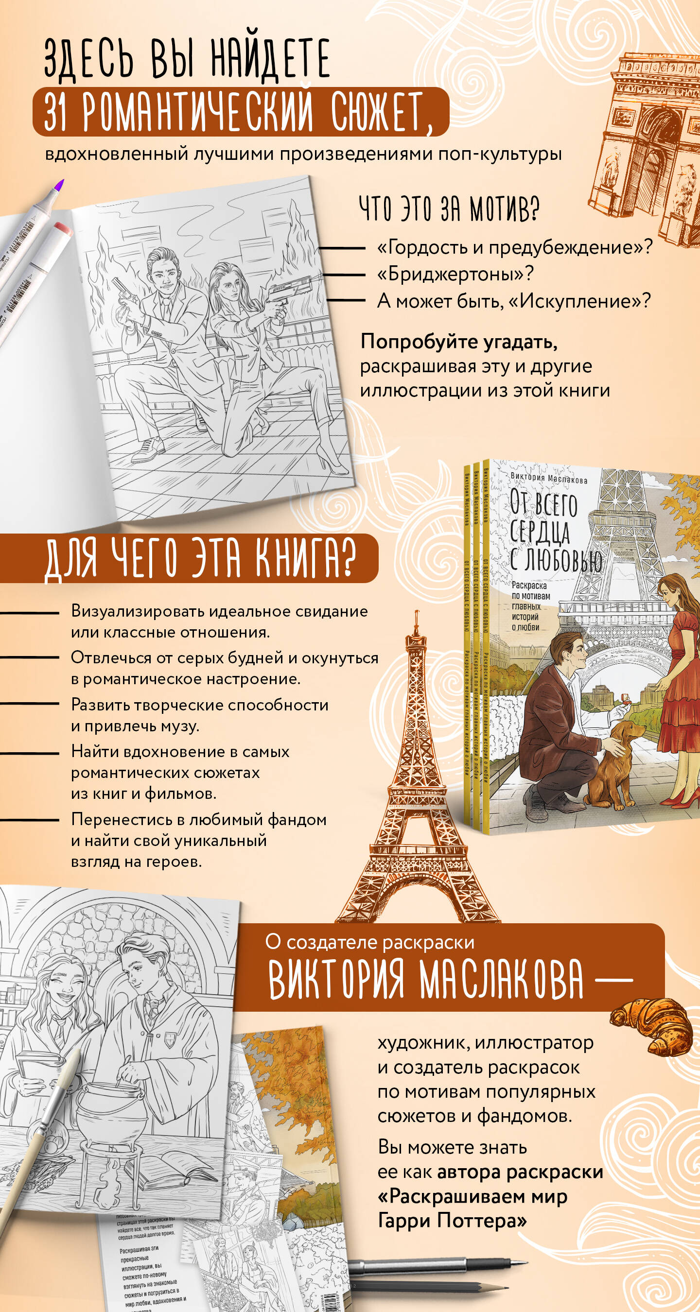 Любовь спасет мир! Именно поэтому художница и иллюстратор Виктория Маслакова создала самую романтичную раскраску на свете! Под одной обложкой она собрала 31 романтический сюжет, вдохновленный самыми известными книгами, фильмами и поп-культурными темами. От каноничной пары популярного спортсмена и тихой отличницы до культовых сюжетов из кино - в этой раскраске каждый найдет что-то себе по душе. Устраивайтесь поудобнее, берите любимые художественные материалы и впустите в свою жизнь любовь!| Издательство | ООО "Издательство "Эксмо" |