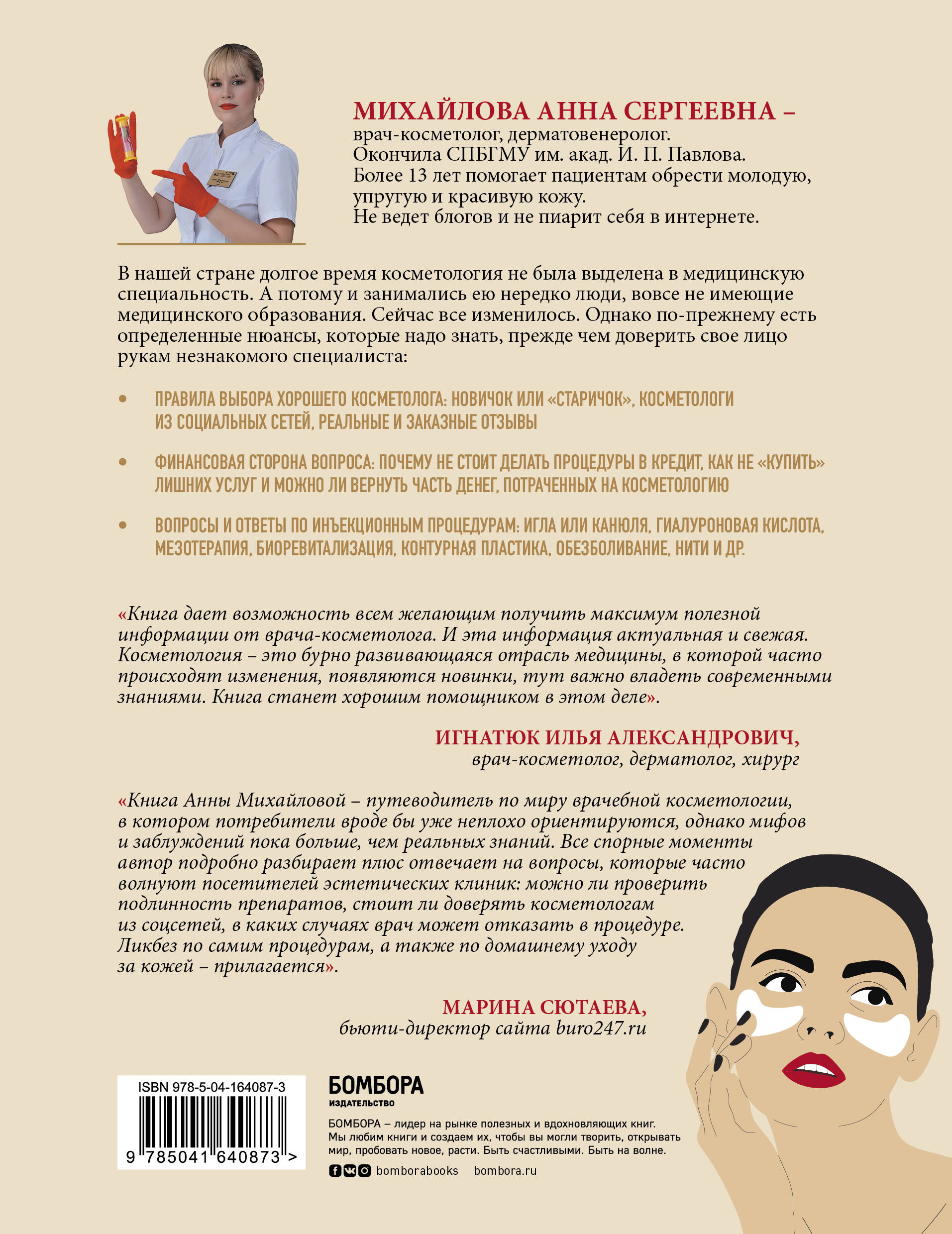 Книга состоит из нескольких частей. Для начала читатель разберется во всех тонкостях организационных моментов: как выбрать специалиста, на что обратить внимание, какие вопросы задавать, что делать в конфликтных ситуациях и множество других. Далее подробно рассказано об особенностях наиболее распространенных инъекционных процедур: для чего они применяются, кому полезны, когда и сколько их нужно сделать для достижения результата. Мир филлеров, ботокса и гиалуронки больше не будет таким запутанным и пугающим. И в заключение пошагово расписан домашний уход, который так важен для поддержания результата от проведенных процедур. Здесь найдутся ответы практически на все вопросы женщин в любом возрасте и с любым состоянием кожи.| Издательство | Эксмо |