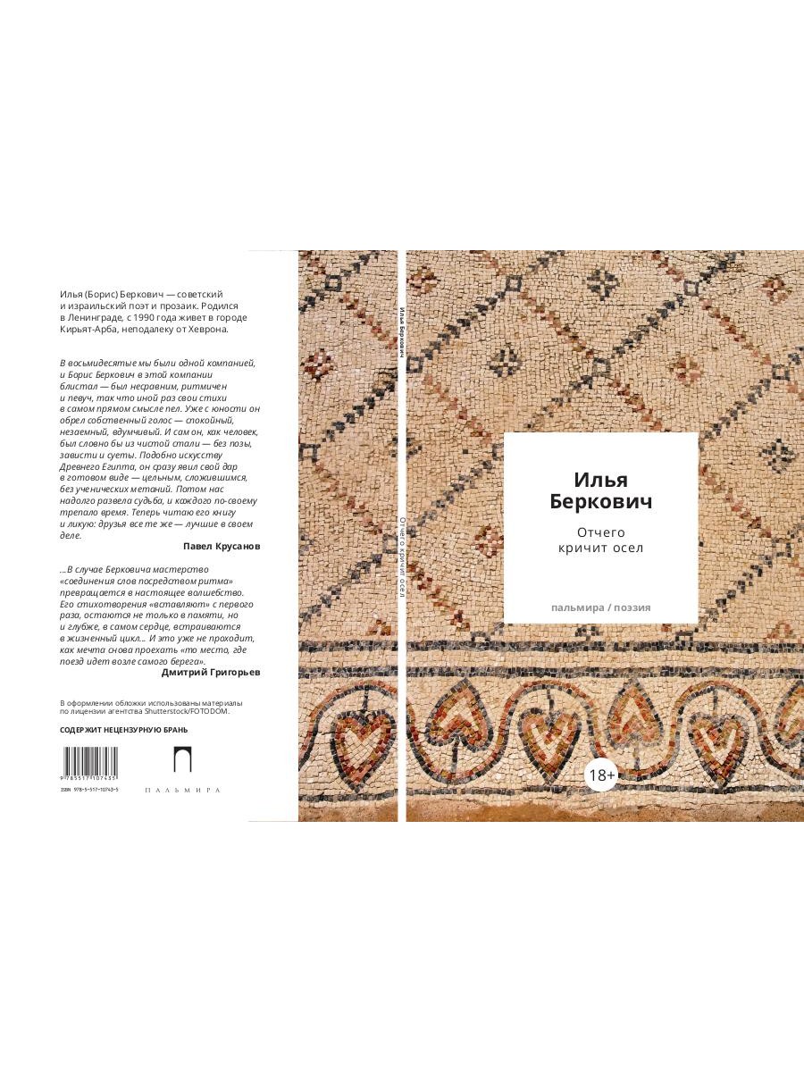 Этот сборник стихов советского и израильского поэта Ильи Берковича читатели ждали сорок лет. Беркович ярко и самобытно дебютировал в начале восьмидесятых в журналах ленинградского андеграунда, его стихи читали наизусть и перепечатывали по памяти. В эту небольшую книгу вошли тексты разных лет, отобранные самим автором.| Издательство | Т8 RUGRAM |