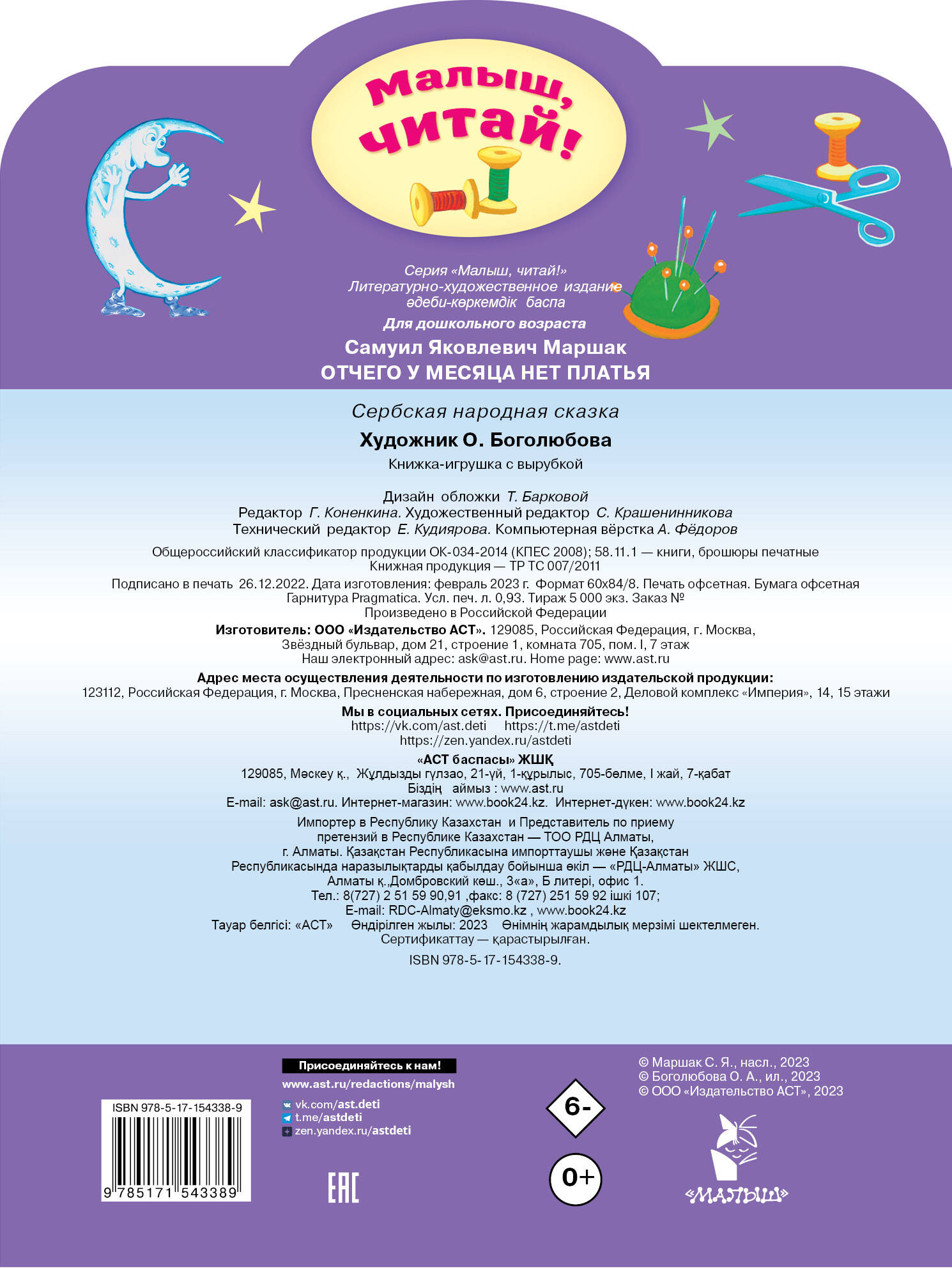 Отчего у месяца нет платья? Не догадываетесь? Прочитайте интересную сказку С. Маршака и узнайте ответ на этот вопрос. Рисунки О. Боголюбовой.| Издательство | ИЗДАТЕЛЬСТВО "АСТ" |