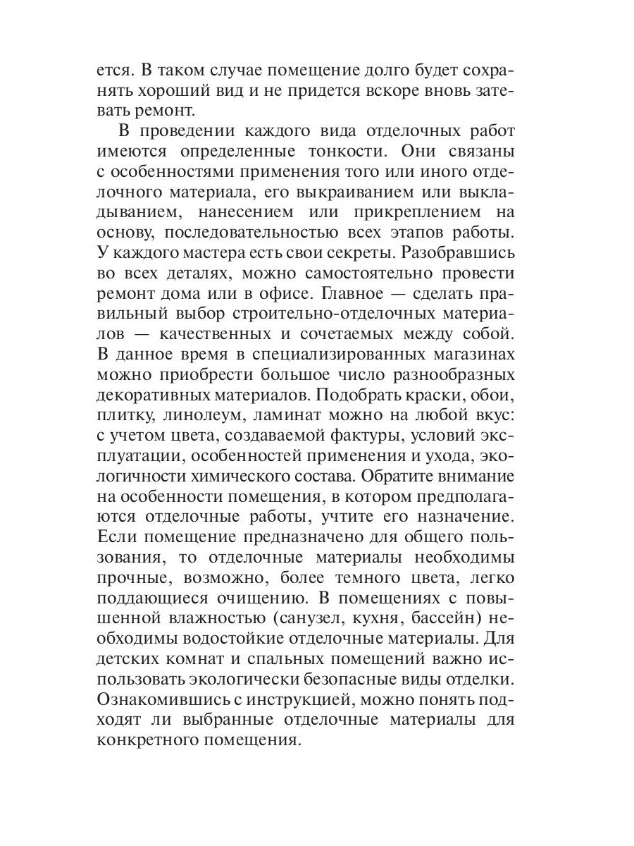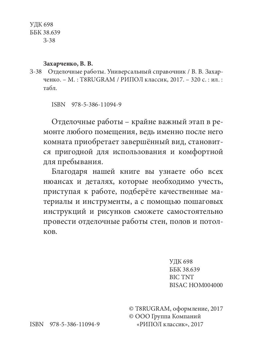 Отделочные работы - крайне важный этап в ремонте любого помещения, ведь именно после него комната приобретает завершённый вид, становится пригодной для использования и комфортной для пребывания. Благодаря нашей книге вы узнаете обо всех нюансах и деталях, которые необходимо учесть, приступая к работе, подберёте качественные материалы и инструменты, а с помощью пошаговых инструкций и рисунков сможете самостоятельно провести отделочные работы стен, полов и потолков.| Издательство | РИПОЛ классик Группа Компаний ООО |