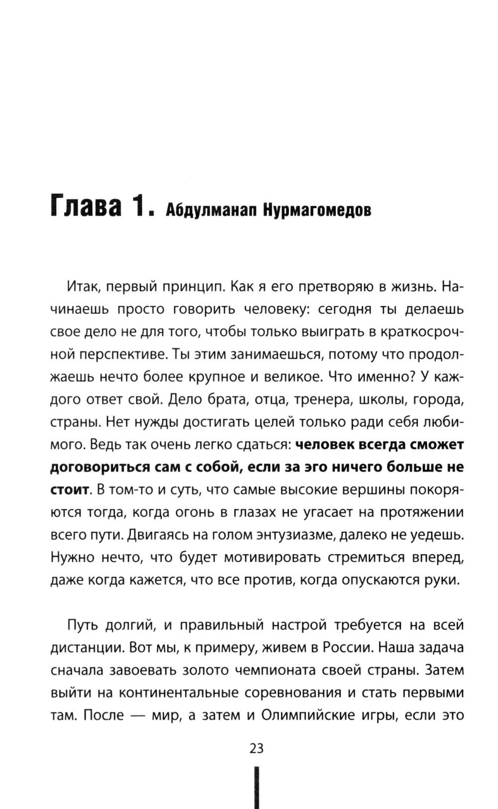 За великими чемпионами всегда стоят те, кто их воспитал. Эти люди нечасто оказываются в свете софитов, потому что не стремятся туда попасть. Но именно они и влияют на становление кумиров миллионов. Их вклад - на самом глубинном уровне. Их поле битвы - тысячи часов невидимой для телекамер тяжелой работы на результат. Это - отцы-основатели. Игорь Рыбаков и Абдулманап Нурмагомедов имеют много общего. Каждый стал мировым лидером в том, что делает. Оба долгие годы посвятили развитию - себя, проектов, бизнесов, сотрудников - и детей. И теперь вы держите в руках первую совместную работу двух гранд-мастеров - книгу, посвященную воспитанию. Воспитанию чемпионов в спорте, бизнесе и жизни. Под обложкой 5 авторских принципов, которые вместе образуют универсальную систему достижения результата. Примерьте ее на себя прямо сейчас!| Издательство | АСТ |