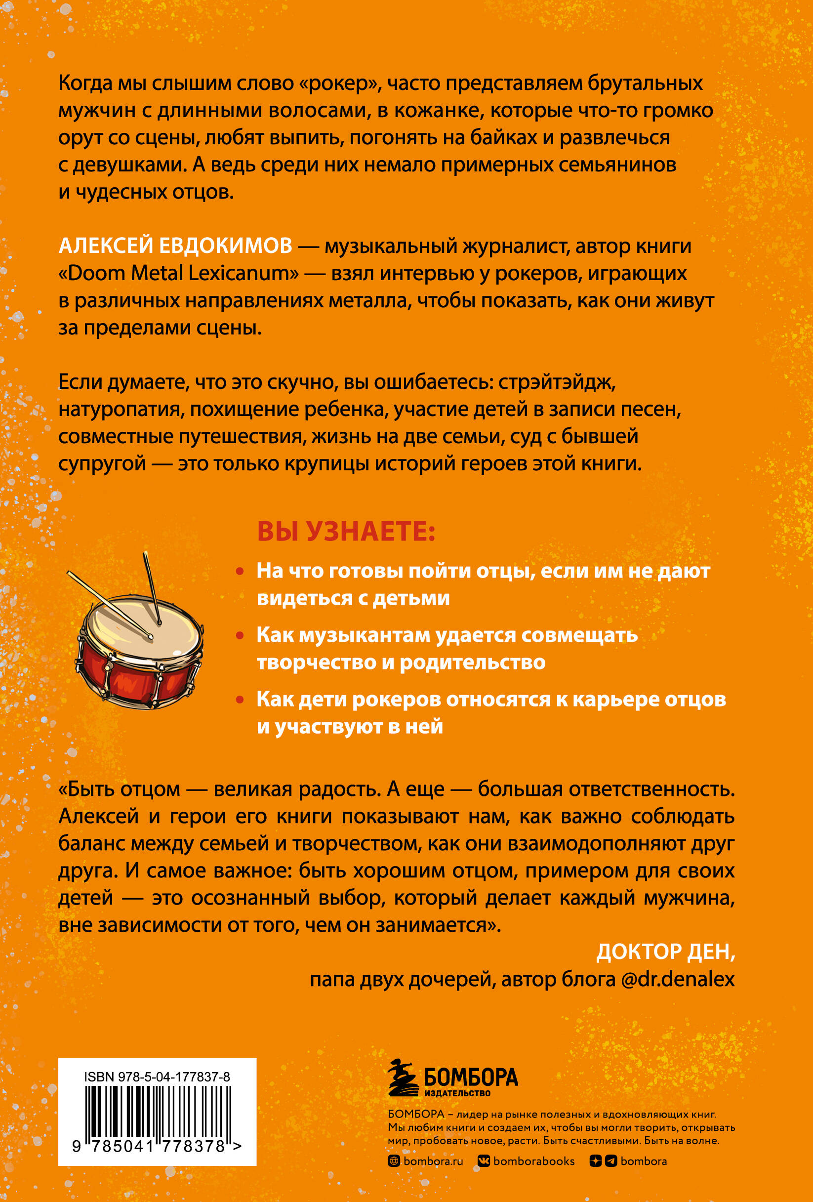 Когда мы слышим слово «рокер», часто представляем брутальных мужчин с раскрашенным лицом, длинными волосами, в кожанке, которые что-то громко орут со сцены, любят выпить, погонять на байках и развлечься с девушками. А ведь среди них немало примерных семьянинов и чудесных отцов. Алексей Евдокимов - музыкальный журналист, автор книги «Doom Metal Lexicanum» взял интервью у рокеров, играющих в различных направлениях метала, чтобы показать, как они живут за пределами сцены. Если вы думаете, что это скучно, вы ошибаетесь: стрэйтэйдж, натуропатия, похищение ребенка, участие детей в записи песен, совместные путешествия, жизнь на две семьи, суд с бывшей супругой - это только крупицы историй героев этой книги. ВЫ УЗНАЕТЕ: - На что готовы пойти отцы, если им не дают видеться с детьми. - Как музыкантам удается совмещать творчество и родительство. - Как дети рокеров относятся к карьере отцов и участвуют в ней. ОТЗЫВ: «Быть отцом - великая радость. А еще - это большая ответственность. Алексей и герои его книги показывают нам, как важно соблюдать баланс между семьей и творчеством, как они взаимодополняют друг друга. И самое важное: быть хорошим отцом, примером для своих детей - это осознанный выбор, который делает каждый мужчина, вне зависимости от того, чем он занимается». - Доктор Дэн, папа двух дочерей, автор блога @dr.denalex| Издательство | ООО "Издательство "Эксмо" |