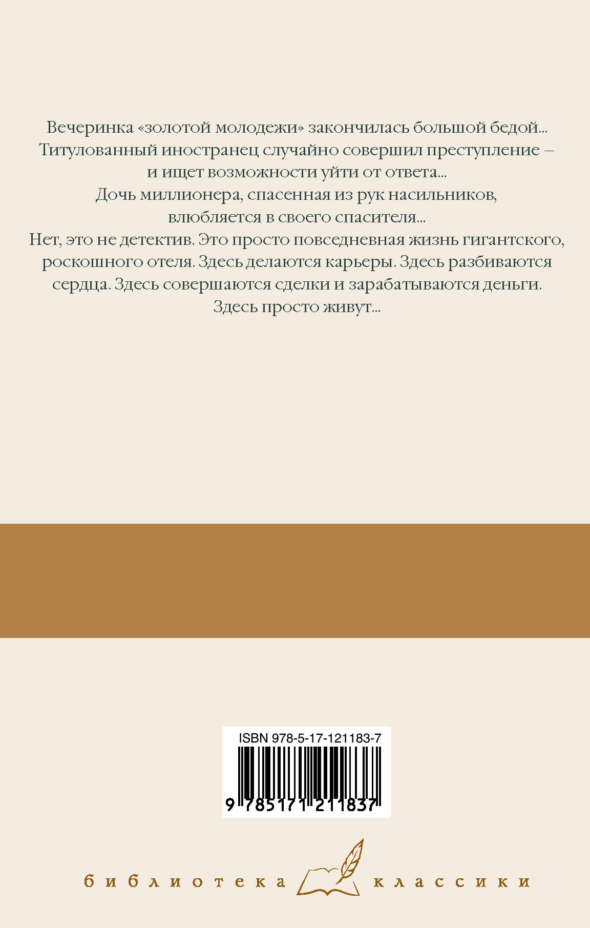 Вечеринка "золотой молодежи" заканчивается большой бедой... Титулованный иностранец случайно совершает преступление - и пытается уйти от ответа... Дочь миллионера, спасенная из рук насильников, влюбляется в своего спасителя... Нет, это не детектив. Это - повседневная жизнь гигантского, роскошного отеля, где возможно все…| Издательство | ИЗДАТЕЛЬСТВО "АСТ" |