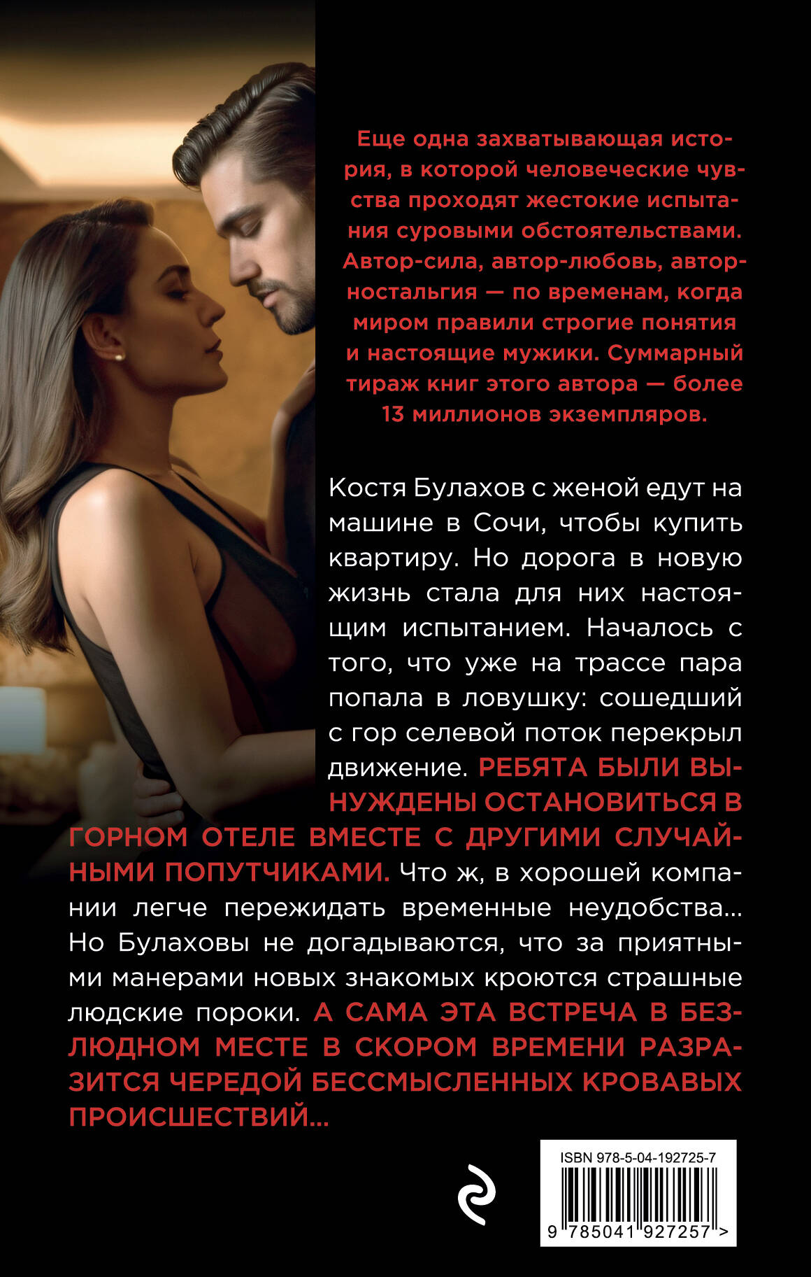 Костя Булахов с женой едут на машине в Сочи, чтобы купить квартиру. Но дорога в новую жизнь стала для них настоящим испытанием. Началось с того, что уже на трассе пара попала в ловушку: сошедший с гор селевой поток перекрыл движение. Ребята были вынуждены остановиться в горном отеле вместе с другими случайными попутчиками. Что ж, в хорошей компании легче пережидать временные неудобства... Но Булаховы не догадываются, что за приятными манерами новых знакомых кроются страшные людские пороки. А сама эта встреча в безлюдном месте в скором времени разразится чередой бессмысленных кровавых происшествий… Еще одна захватывающая история, в которой человеческие чувства проходят жестокие испытания суровыми обстоятельствами. Автор-сила, автор-любовь, автор-ностальгия - по временам, когда миром правили строгие понятия и настоящие мужики. Суммарный тираж книг этого автора - более 13 миллионов экземпляров.| Издательство | ООО "Издательство "Эксмо" |