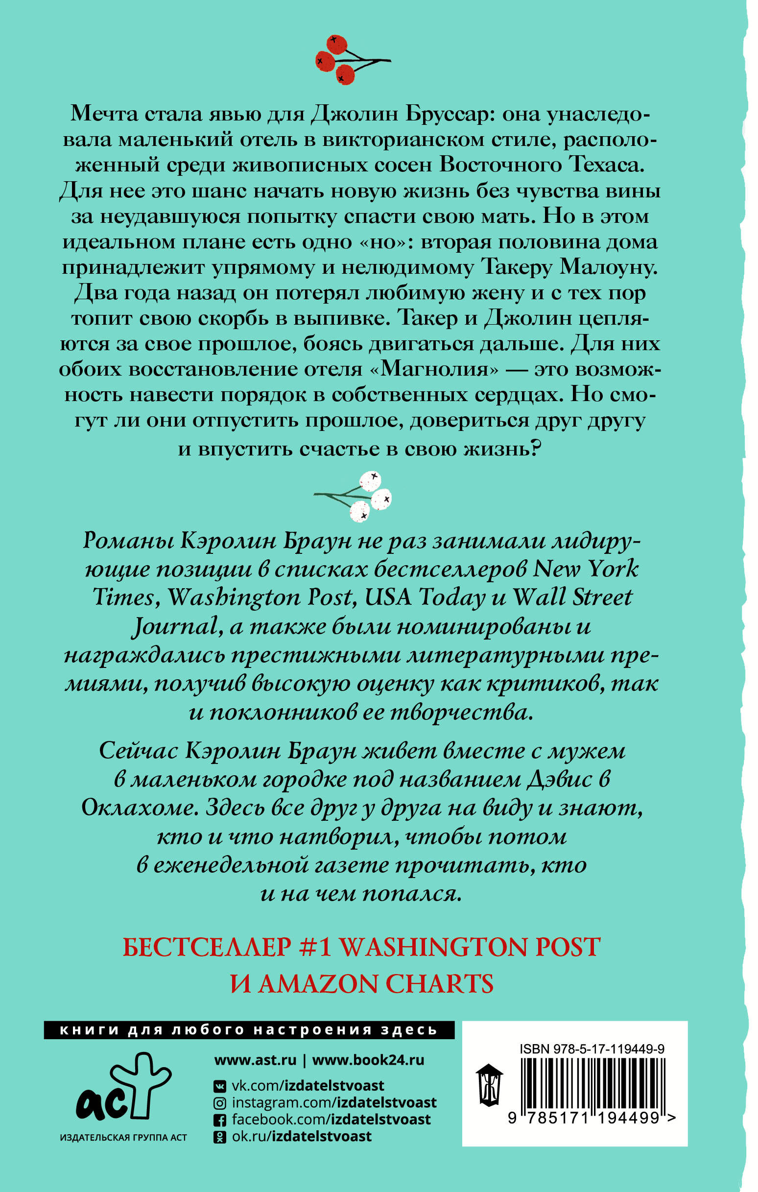 Мечта стала явью для Джолин Бруссар: она унаследовала маленький отель в викторианском стиле, расположенный среди живописных сосен Восточного Техаса. Для нее это шанс начать новую жизнь без чувства вины за неудавшуюся попытку спасти свою мать. Но в этом идеальном плане есть одно "но": вторая половина дома принадлежит упрямому и нелюдимому Такеру Малоуну. Два года назад он потерял любимую жену и с тех пор топит свою скорбь в выпивке. Такер и Джолин цепляются за свое прошлое, боясь двигаться дальше. Для них обоих восстановление отеля "Магнолия" - это возможность навести порядок в собственных сердцах. Но смогут ли они отпустить прошлое, довериться друг другу и впустить счастье в свою жизнь?| Издательство | ИЗДАТЕЛЬСТВО "АСТ" |