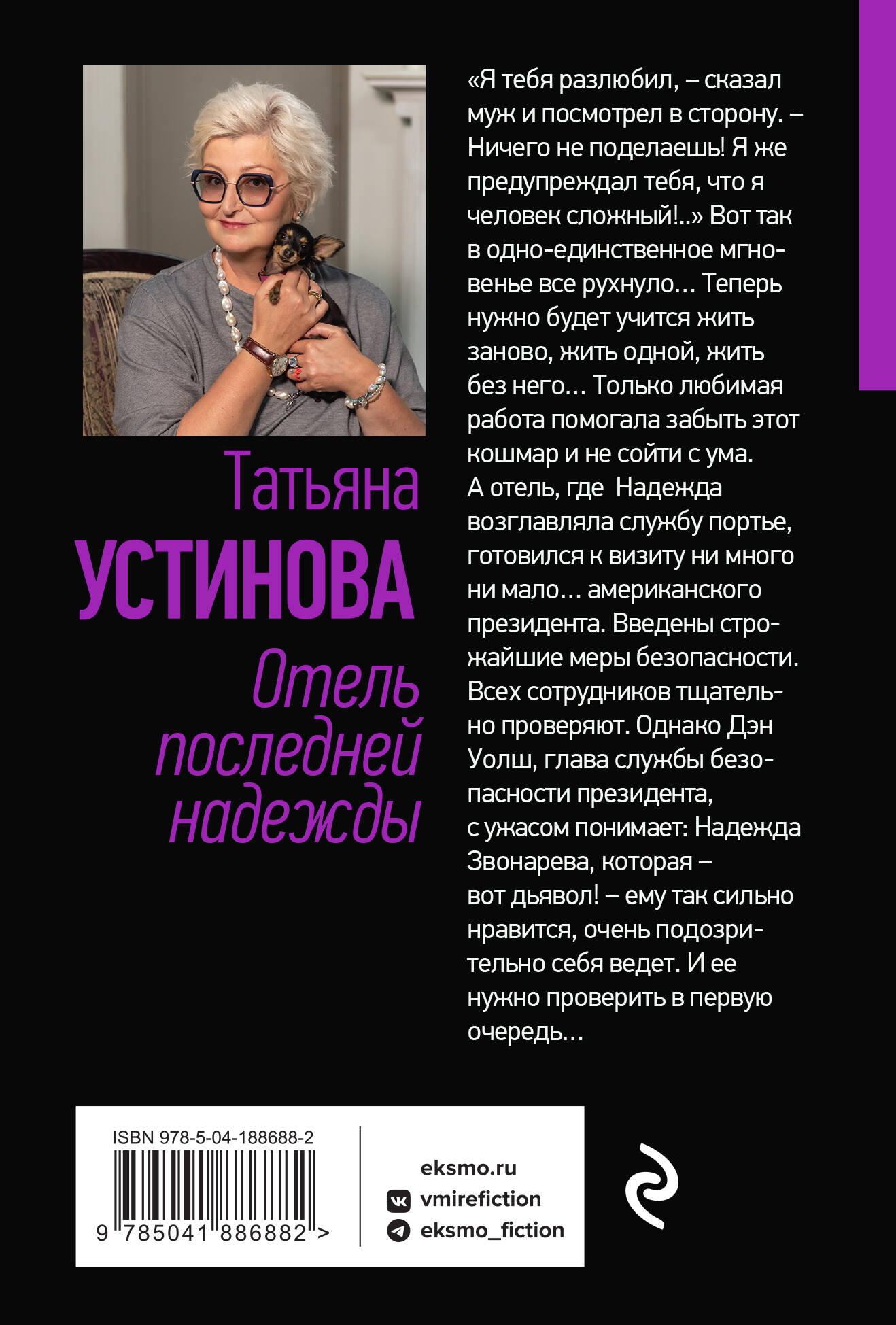 «Я тебя разлюбил, - сказал муж и посмотрел в сторону. - Ничего не поделаешь! Я же предупреждал тебя, что я человек сложный!..» Вот так в одно-единственное мгновенье все рухнуло… Теперь нужно будет учиться жить заново, жить одной, жить без него… Только любимая работа помогала забыть этот кошмар и не сойти с ума. А отель, где Надежда возглавляла службу портье, готовился к визиту ни много ни мало… американского президента. Введены строжайшие меры безопасности. Всех сотрудников тщательно проверяют. Однако Дэн Уолш, глава службы безопасности президента, с ужасом понимает: Надежда Звонарева, которая - вот дьявол! - ему так сильно нравится, очень подозрительно себя ведет. И ее нужно проверить в первую очередь… Татьяна Устинова - один из топовых авторов современной российской прозы, обладатель двух премий «Электронная буква», лауреат «ТЭФИ» в номинации «Сценарист телевизионного фильма». «Первая среди лучших» - так называют Татьяну Витальевну, и это не просто остроумный эпитет, а звание, подтвержденное десятками написанных романов, успешными экранизациями и, конечно, любовью многочисленных поклонников ее творчества.| Издательство | ООО "Издательство "Эксмо" |