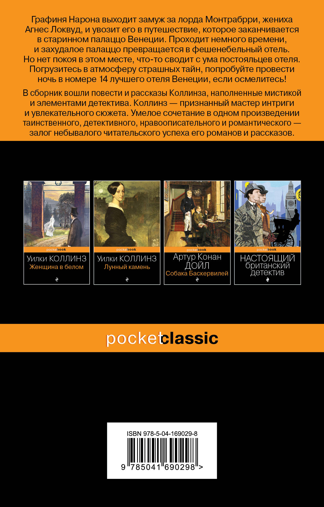 От автора знаменитых произведений «Лунный камень» и «Женщина в белом» ещё один захватывающий роман викторианской эпохи - «Отель с привидениями: Тайна современной Венеции». Английский писатель Уильям Уилки Коллинз (1824-1889) по праву считается основоположником так называемого «сенсационного романа», впоследствии разделившегося на приключенческий и детективный жанры. Коллинз - признанный мастер интриги и увлекательного сюжета. Умелое сочетание в одном произведении таинственного, детективного, нравоописательного и романтического - залог небывалого читательского успеха его романов и рассказов. Графиня Нарона выходит замуж за лорда Монтрабрри, жениха Агнес Локвуд, и увозит его в путешествие, которое заканчивается в старинном палаццо Венеции. Странные вещи происходят в этом особняке, исчезновение, смерть... Проходит немного времени, и захудалое палаццо превращается в фешенебельный отель. Но нет покоя в этом месте, что-то сводит с ума постояльцев отеля. Погрузитесь в атмосферу страшных тайн, попробуйте провести ночь в номере 14 лучшего отеля Венеции, если осмелитесь! В сборник вошли повести и рассказы Коллинза, также наполненные мистикой и элементами детектива.| Издательство | ООО "Издательство "Эксмо" |