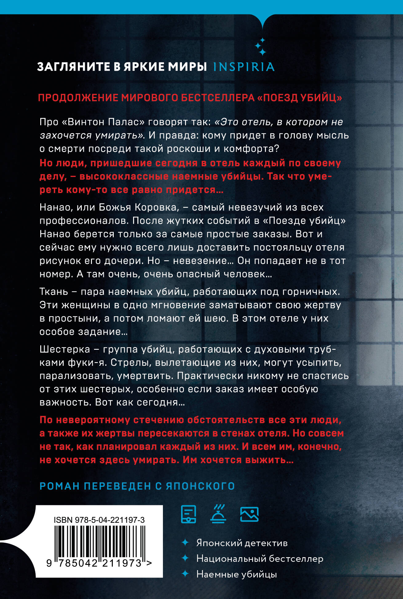 ПРОДОЛЖЕНИЕ МИРОВОГО БЕСТСЕЛЛЕРА «ПОЕЗД УБИЙЦ». КУЛЬТОВЫЙ ТРИЛЛЕР В ЯПОНИИ. Про «Винтон Палас» говорят так: «Это отель, в котором не захочется умирать». И правда: кому придет в голову мысль о смерти посреди такой роскоши и комфорта? Но люди, пришедшие сегодня в отель каждый по своему делу, - высококлассные наемные убийцы. Так что умереть кому-то все равно придется… Нанао, или Божья Коровка, - самый невезучий из всех профессионалов. После жутких событий в «Поезде убийц» Нанао берется только за самые простые заказы. Вот и сейчас ему нужно всего лишь доставить постояльцу отеля рисунок его дочери. Но - невезение… Он попадает не в тот номер. А там очень, очень опасный человек… Ткань - пара наемных убийц, работающих под горничных. Эти женщины в одно мгновение заматывают свою жертву в простыни, а потом ломают ей шею. В этом отеле у них особое задание… Шестерка - группа убийц, работающих с духовыми трубками фуки-я. Стрелы, вылетающие из них, могут усыпить, парализовать, умертвить. Практически никому не спастись от этих шестерых, особенно если заказ имеет особую важность. Вот как сегодня… По невероятному стечению обстоятельств все эти люди, а также их жертвы, пересекаются в стенах отеля. Но совсем не так, как планировал каждый из них. И всем им, конечно, не хочется здесь умирать. Им хочется выжить… РОМАН ПЕРЕВЕДЕН С ЯПОНСКОГО. _____________________________________________________________ «…Тарантиновское сочетание оригинального остроумия и стилизованного насилия». - The Times «Очень увлекательно и захватывающе… Множество твистов - и стильный изящный финал». - Sunday Express «Исака знает, как держать своих читателей в напряжении». - Crime Fiction Lover| Издательство | ООО "Издательство "Эксмо" |