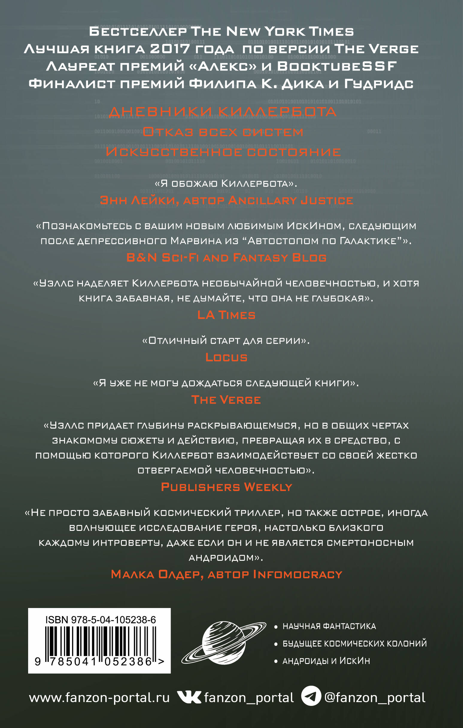 В далёком корпоративном будущем каждая космическая экспедиция обязана получить от Компании разрешение, снаряжение и специальных охранных андроидов. Но в условиях реальной экономики безопасность - не самое главное. На далекой планете команда ученых проводит исследования, а их охранят мыслящий андроид Компании. После того, как он «хакнул» свой модуль управления, он получил свободу и стал называть себя «Киллерботом». Люди его не интересуют, и все, что он действительно хочет - это смотреть в одиночестве скачанную медиатеку с 35 000 часов кинофильмов и сериалов. Однако, миссия и сама планета оказываются гораздо опаснее, чем в брифинге Компании. И Киллерботу придется выяснить, что происходит и как он со всем связан. «Отказ всех систем» и «Искусственное состояние» - первый и второй дневники Киллербота. Пять причин прочитать: - Феноменальная книга, получившая почти все фантастические премии. - Два романа серии «Дневники Киллербота» под одной обложкой. - Научная фантастика с социальным и психологическим уклоном. - Приключения андроида Киллербота в мире космических колоний далекого будущего. - Книга наполнена добродушным и человечным юмором в стиле Дугласа Адамса.