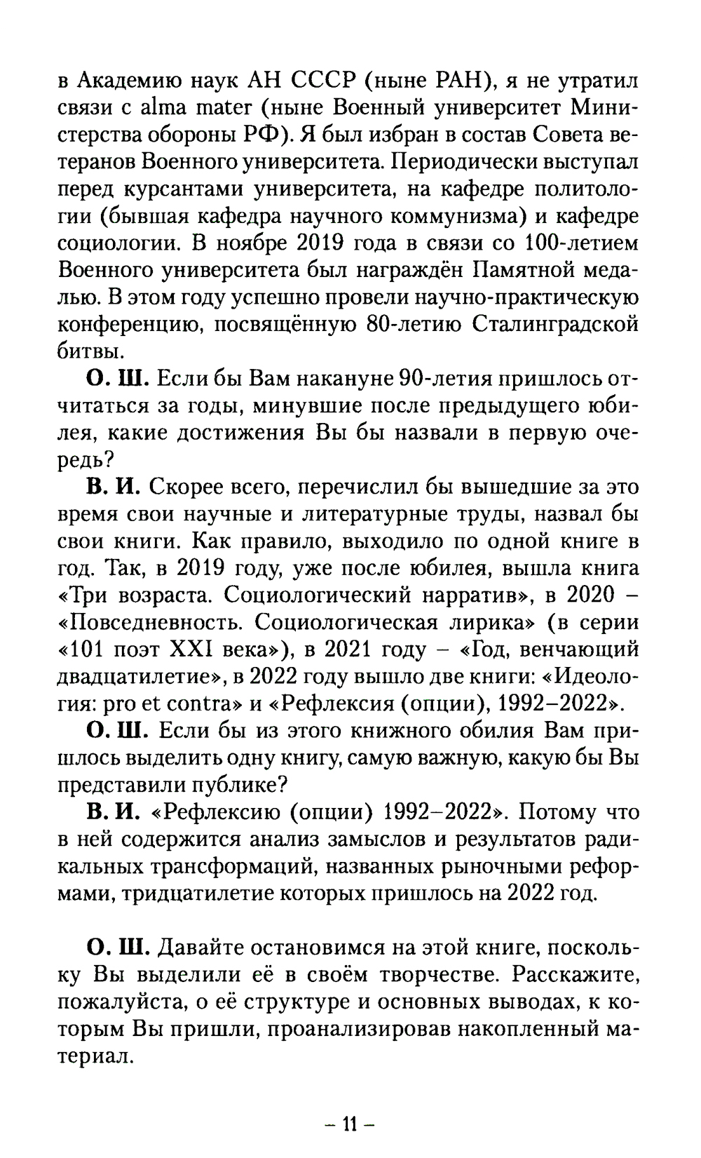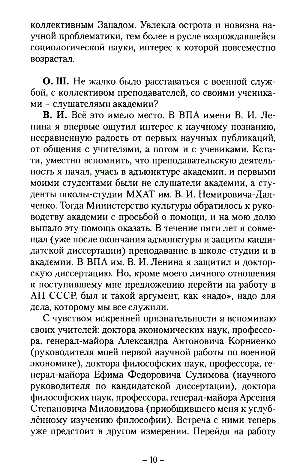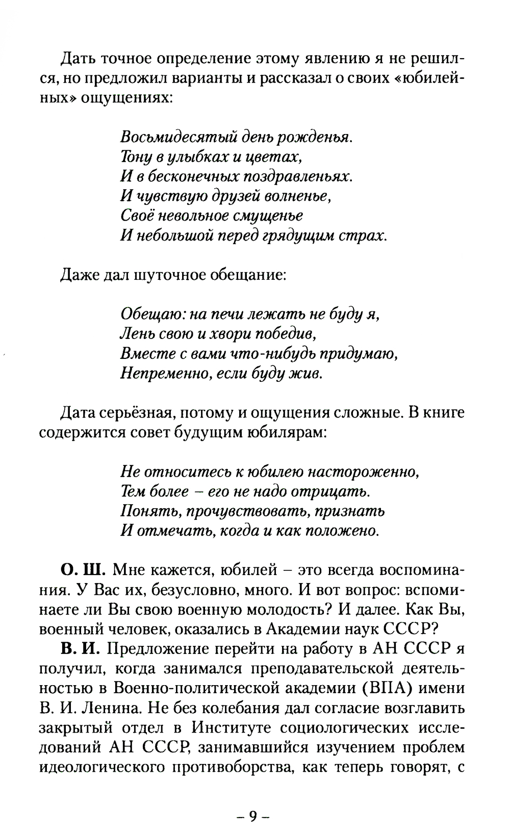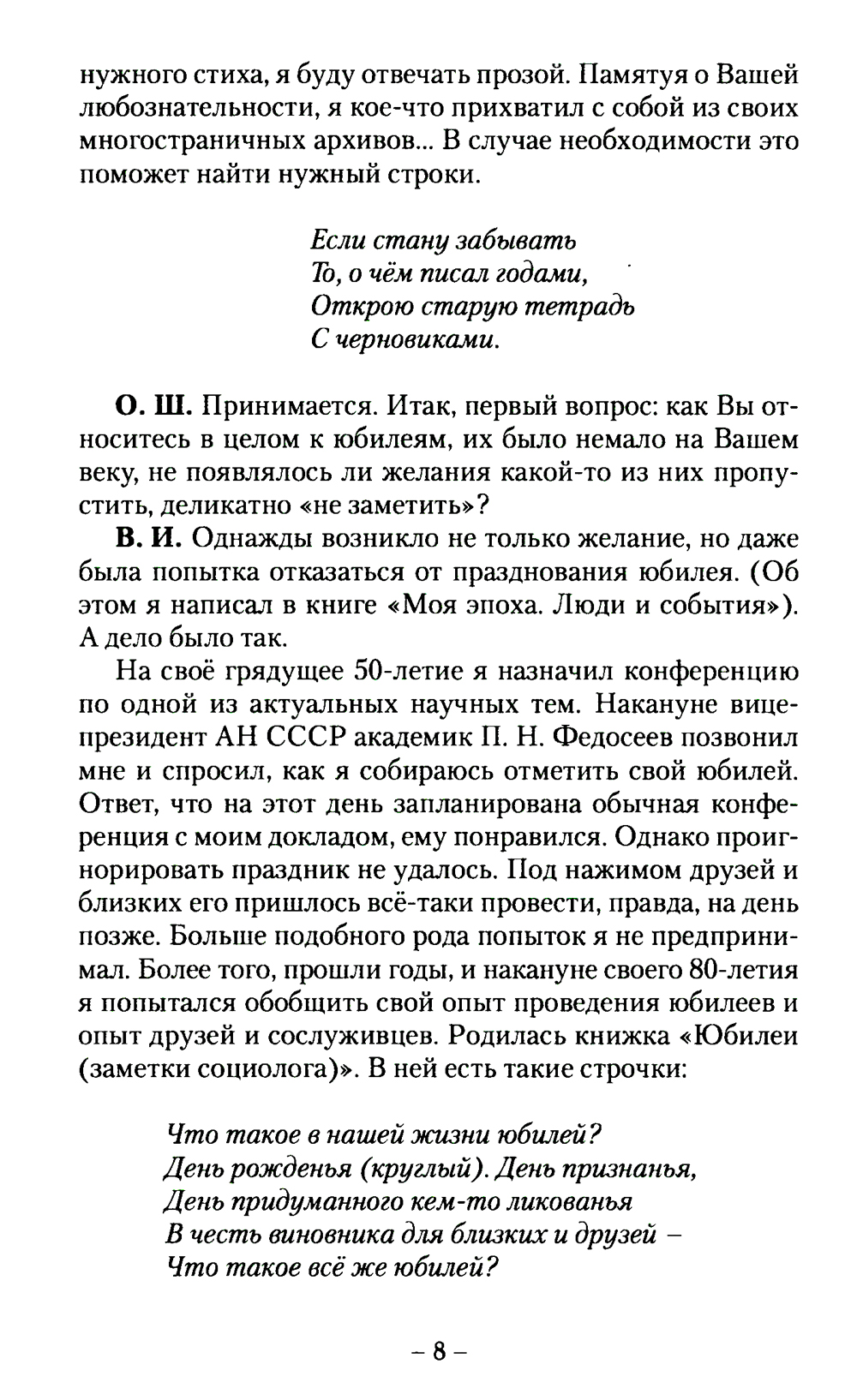 В преддверии своего юбилея известный социолог и литератор в беседе с ответственным секретарём альманаха «У Никитских ворот» рассказывает о том, что непосредственно предшествовало этой дате, что удалось сделать, какие события в жизни страны оставили о себе яркую память. Заданные ему вопросы касались не только профессиональной деятельности будущего юбиляра, но и так называемых вечных тем. В. Н. Иванов - достойный представитель своего поколения - поколения детей войны. Его воспоминания, оценки и размышления будут интересны людям разных возрастов, но прежде всего молодёжи.