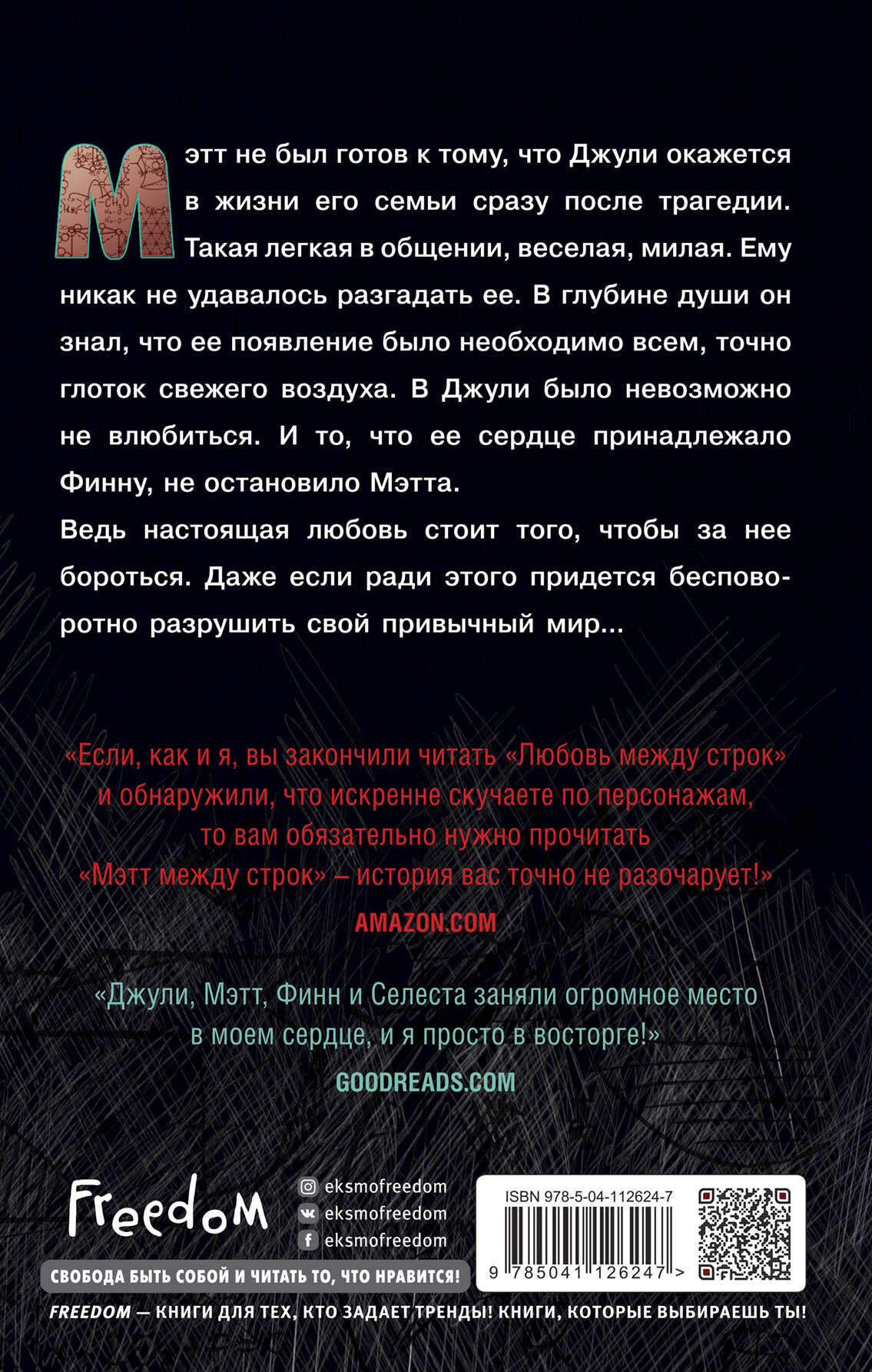 Джессика Парк - это автор, чей роман «180 секунд» оценили более 30 тыс. российских читателей. Ее книги о такой разной, но сильной любви проникают в самую глубину сердца! Романы Джессики Парк не раз покоряли читателей своей искренностью, легким и светлым юмором, живыми и такими близкими нам героями. Книга «Любовь между строк» уже не один год успешно продается в 12 странах мира! А продолжение серии «Мэтт между строк» не менее захватывающее. В ней ты больше узнаешь о Мэтте, симпатичном парне, увлеченном компьютерами, и его отношениях с братом Финном до трагедии. А также о том, как развивались его отношения с Джули, которой удалось вернуть его к жизни. «Прекрасно написанная, эта книга заполняет пробелы и добавляет еще больше глубины в блестящую историю». - Amazon.com