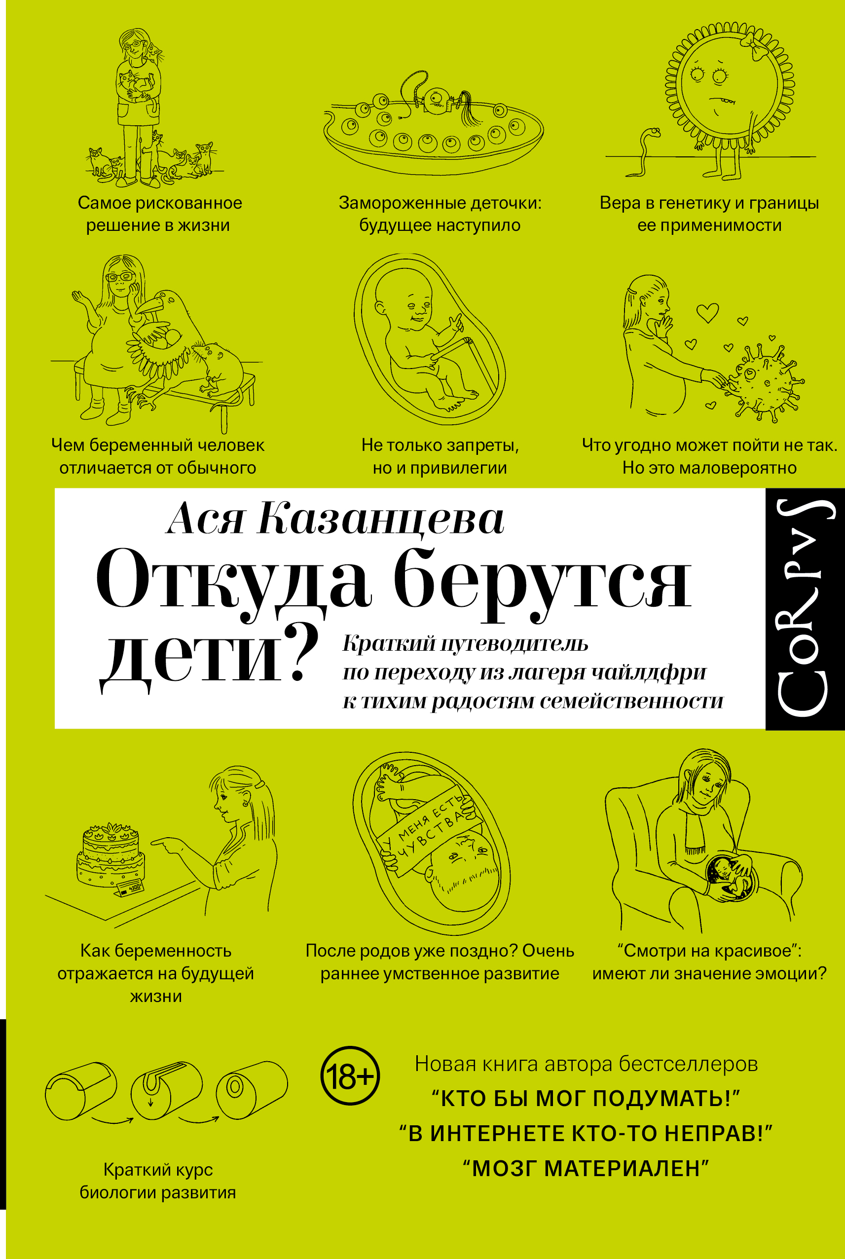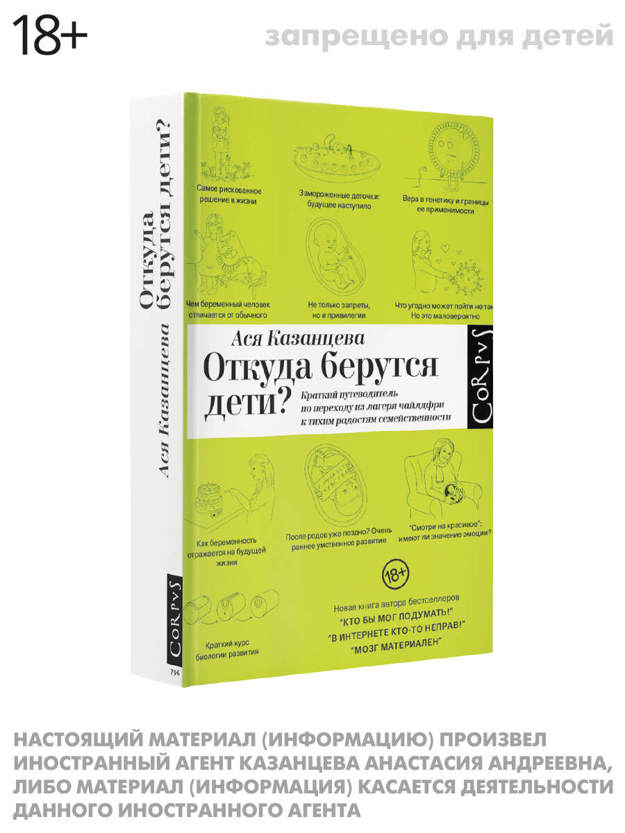 18+ НАСТОЯЩИЙ МАТЕРИАЛ (ИНФОРМАЦИЯ) ПРОИЗВЕДЁН, РАСПРОСТРАНЕН И (ИЛИ) НАПРАВЛЕН ИНОСТРАННЫМ АГЕНТОМ КАЗАНЦЕВОЙ АНАСТАСИЕЙ АНДРЕЕВНОЙ ЛИБО КАСАЕТСЯ ДЕЯТЕЛЬНОСТИ ИНОСТРАННОГО АГЕНТА КАЗАНЦЕВОЙ АНАСТАСИИ АНДРЕЕВНЫ "Откуда берутся дети" - новая книга известной журналистки и автора бестселлеров "Кто бы мог подумать!", "В интернете кто-то неправ!" и "Мозг материален" Аси Казанцевой. Детеныши многих животных рождаются с набором необходимых для выживания навыков, в то время как младенцы появляются на свет абсолютно беспомощными. В этой книге Ася Казанцева развенчивает популярные мифы о беременности и родах и, основываясь на самых современных научных данных, ищет ответы на волнующие родителей вопросы. Помимо результатов научных исследований, в книге представлены рекомендации для нормального развития плода и поддержания здоровья женщины, а также новый взгляд на возможности и перспективы развития современной медицины. Эта книга во многом основана на личном опыте - недавно Ася Казанцева сама стала мамой, и она делится своей трогательной историей любви и принятия. "Откуда берутся дети" - не только сборник научных исследований, написанных простым языком, но и убедительная и проникновенная книга о родительстве, и каждый читатель найдет в ней что-то для себя.| Издательство | Издательство "АСТ" |
