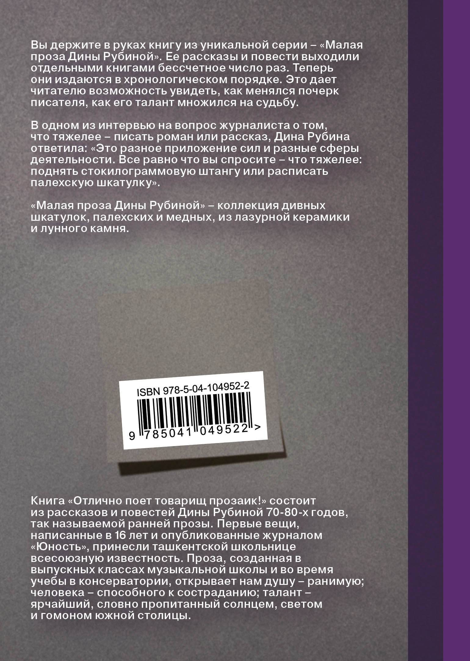 Книга "Отлично поет товарищ прозаик!" состоит из рассказов и повестей Дины Рубиной 70-80-х годов, так называемой ранней прозы. Первые вещи, написанные в 16 лет и опубликованные журналом "Юность", принесли ташкентской школьнице всесоюзную известность. Проза, созданная в выпускных классах музыкальной школы и во время учебы в консерватории, открывает нам душу - ранимую, человека - способного к состраданию, талант - ярчайший, словно пропитанный солнцем, светом и гомоном южной столицы.| Издательство | ООО "Издательство "Эксмо" |