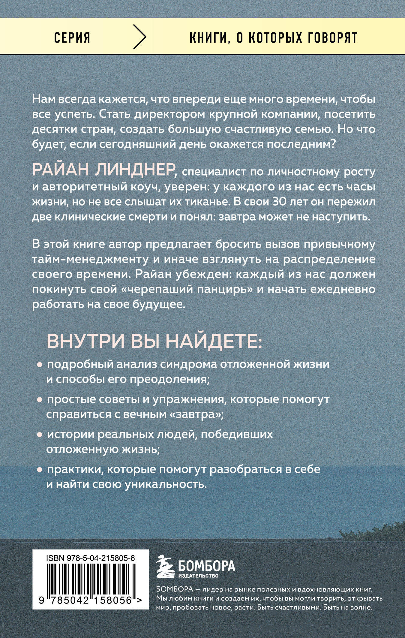 Нам всегда кажется, что впереди еще много времени, чтобы все успеть. Стать директором крупной компании, посетить десятки стран, создать большую счастливую семью. Но что будет, если сегодняшний день окажется последним? Райан Линднер, специалист по личностному росту и авторитетный коуч, уверен: «У каждого из нас есть часы жизни, но не все слышат их тиканье». В свои 30 лет он пережил две клинические смерти и понял - завтра может не наступить. В этой книге автор предлагает бросить вызов привычному тайм-менеджменту и иначе взглянуть на распределение своего времени. Райан убежден - каждый из нас должен покинуть свой «черепаший панцирь» и начать ежедневно работать на свое будущее. Внутри вы найдете: - подробный анализ синдрома отложенной жизни и способы его преодоления; - простые советы и упражнения, которые помогут справиться с вечным «завтра»; - истории реальных людей, победивших «отложенную жизнь»; - практики, которые помогут разобраться в себе и найти свою уникальность.| Издательство | ООО "Издательство "Эксмо" |