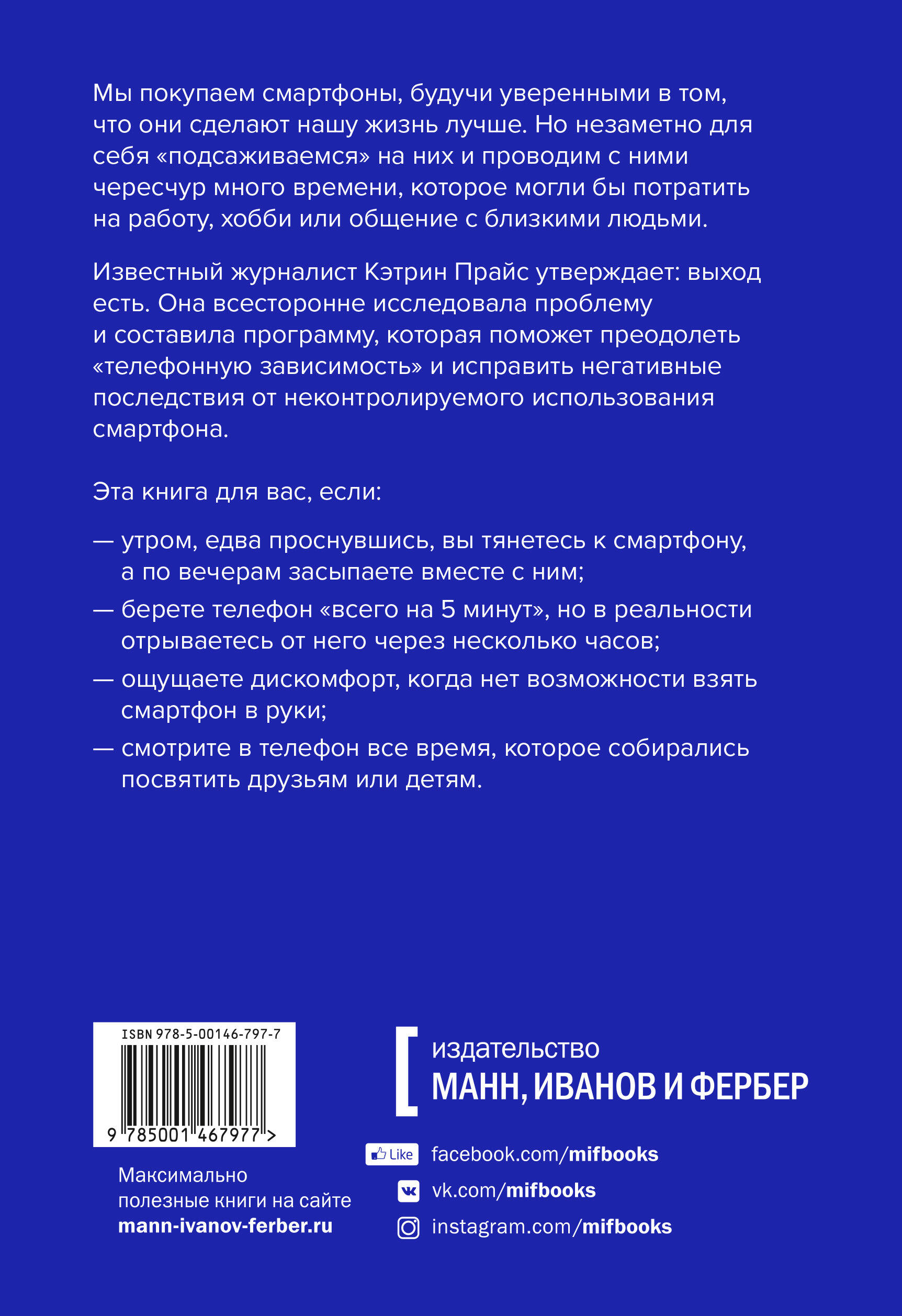 Кэтрин Прайс провела журналистское расследование, итогами которого поделилась в книге. Вы узнаете, как на нас влияет "ненормирование потребление" смартфона, и получите программу, которая помжет наладить с ним здоровые отношения.| Издательство | МАНН, ИВАНОВ И ФЕРБЕР ООО |