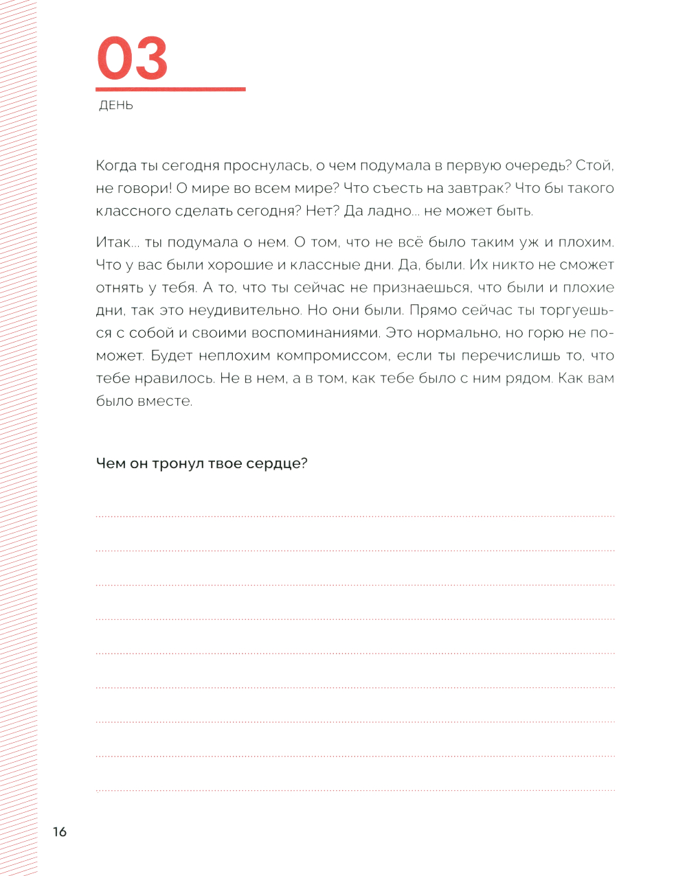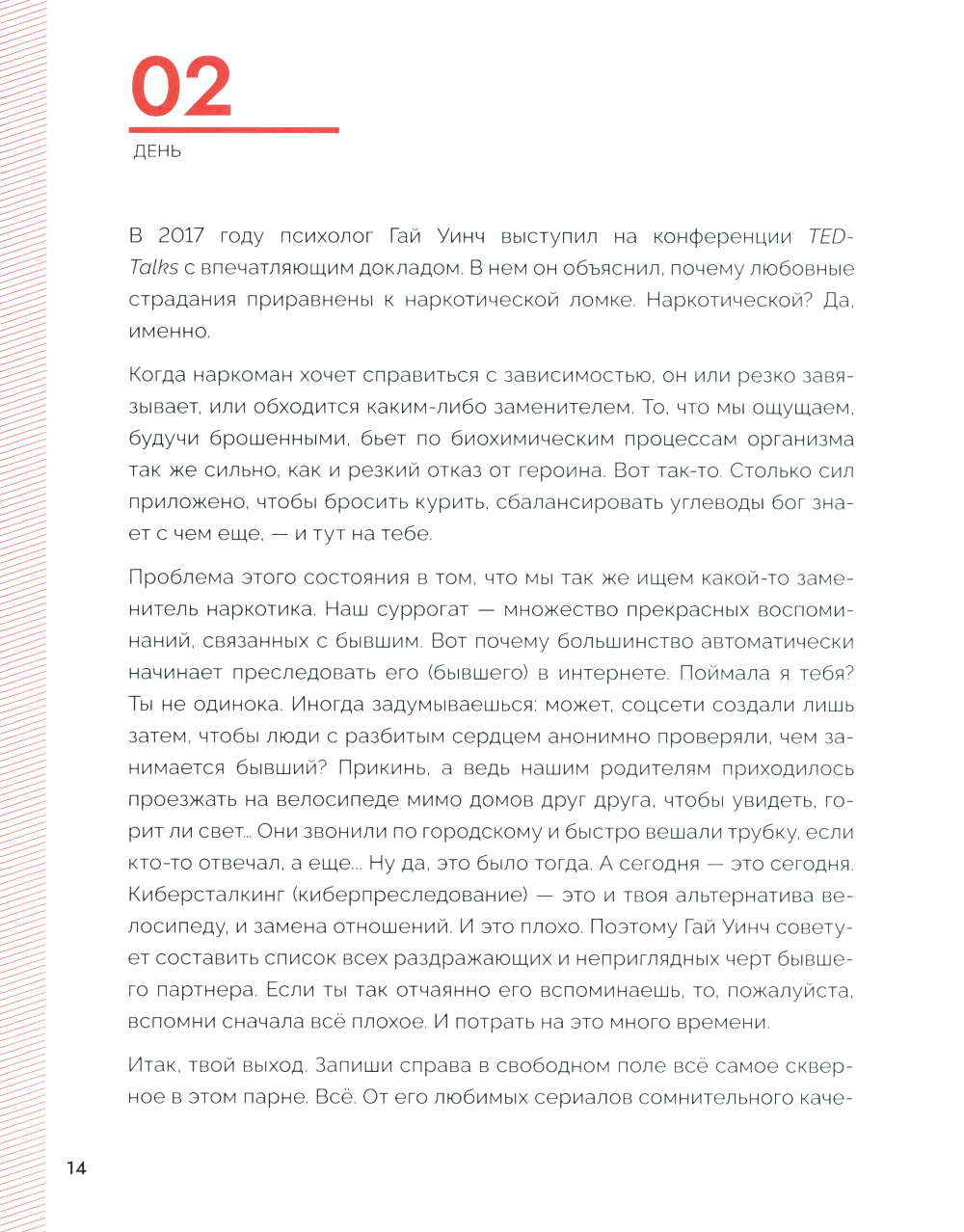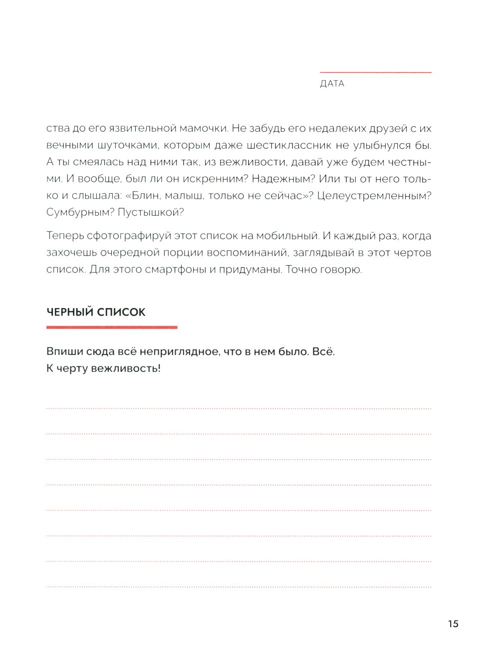 Неразделенная любовь причиняет боль в любом возрасте. Но часто окружающие не догадываются, как можно помочь человеку справиться с этой болью. Хотя именно в данной ситуации помощь очень нужна. Требуется не только эмоциональная поддержка, но и взгляд со стороны - доводы разума. Независимо от того, длились ли любовные отношения шесть месяцев или восемь лет, разрыв всегда протекает одинаково. Первые три месяца после расставания - самые важные, потому что именно в этот период есть шанс вновь обрести себя, собрать по кусочкам. Самый простой способ - задать себе определенные вопросы, выкинуть из головы лишние воспоминания и структурировать мысли и чувства. Обо что эта любовь «разбилась»? Что было хорошего в отношениях, а что плохого? Отпустит ли когда-нибудь? Разделенная на три блока - «Вспомни», «Компенсируй». «Отпусти». - эта книга дает важные мыслительные импульсы, предоставляет на своих страницах достаточно места для размышлений и подсказывает ответ на вопрос, почему наша психика не работает так. как должна, в делах сердечных. И всё это - в течение 99 дней. На равных. С юмором и опорой на актуальные психологические исследования. Лучший союзник, чтобы излечить разбитое сердце.| Издательство | Феникс |