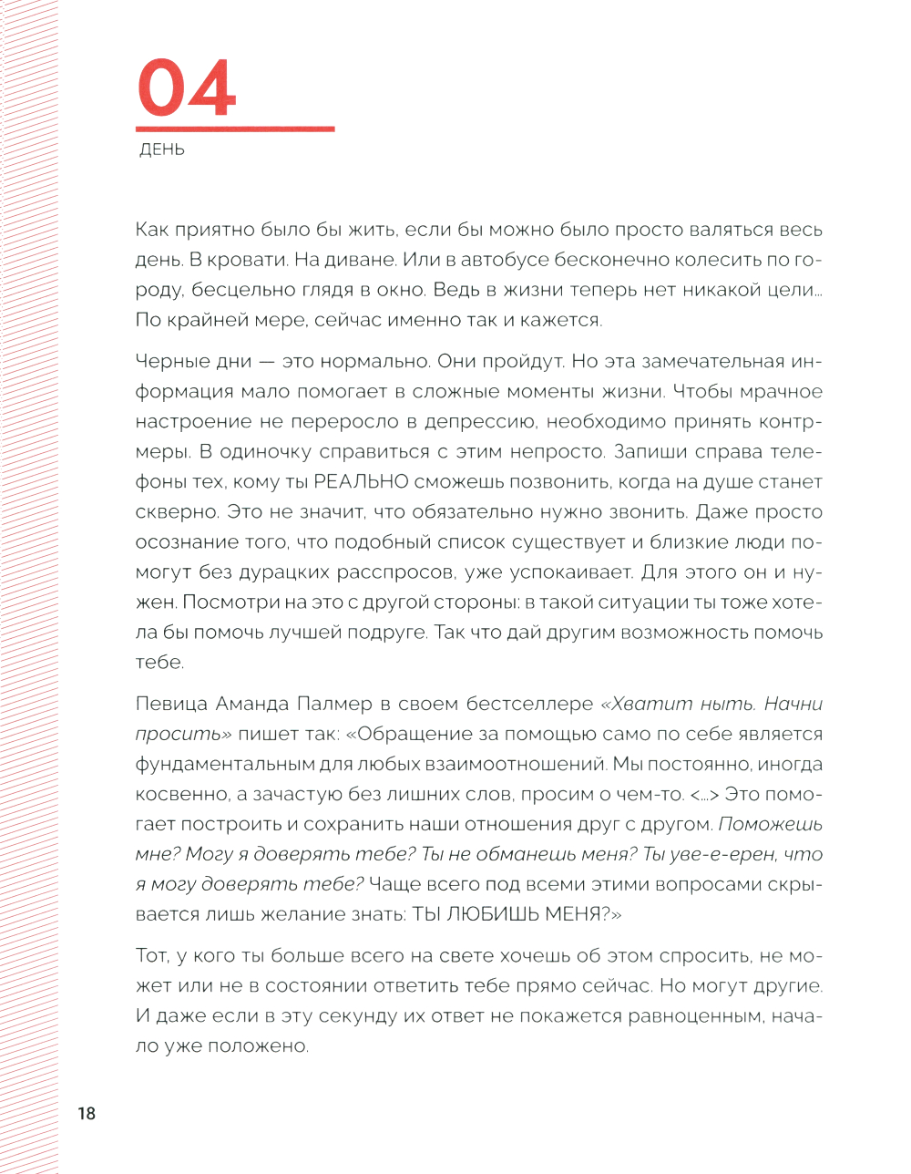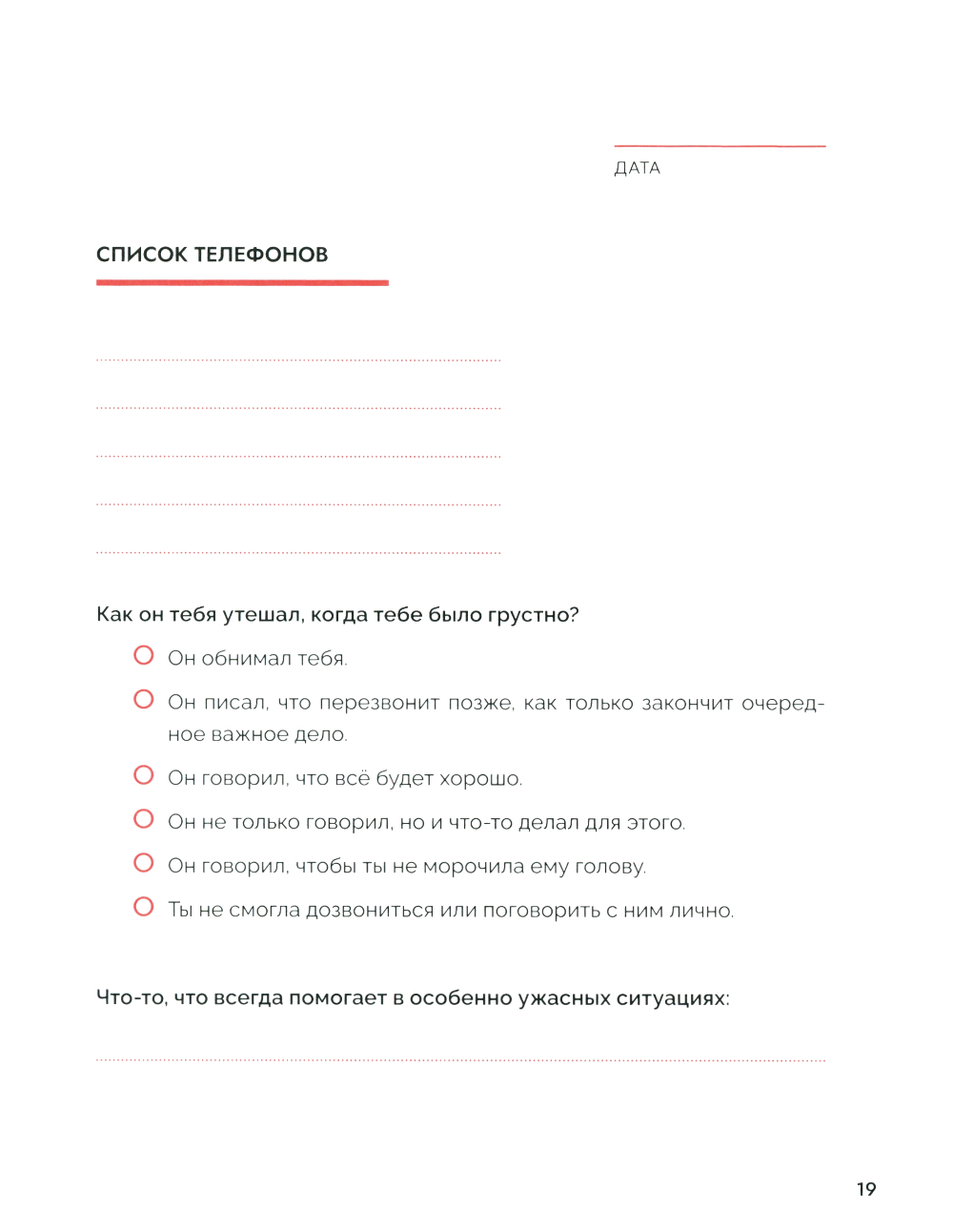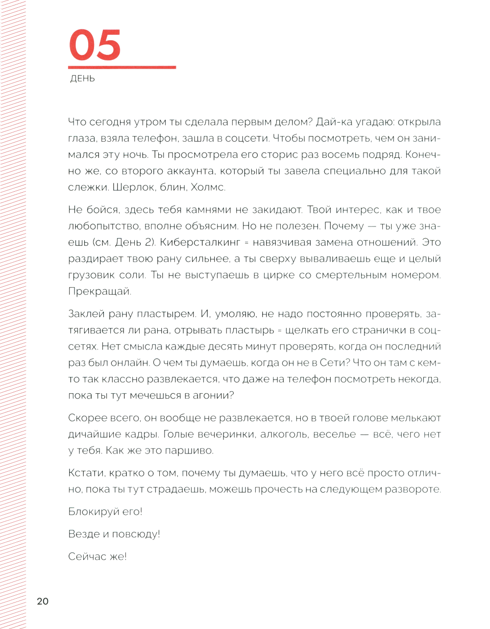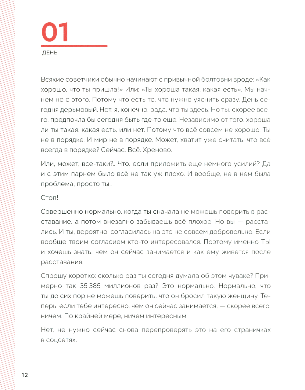 Неразделенная любовь причиняет боль в любом возрасте. Но часто окружающие не догадываются, как можно помочь человеку справиться с этой болью. Хотя именно в данной ситуации помощь очень нужна. Требуется не только эмоциональная поддержка, но и взгляд со стороны - доводы разума. Независимо от того, длились ли любовные отношения шесть месяцев или восемь лет, разрыв всегда протекает одинаково. Первые три месяца после расставания - самые важные, потому что именно в этот период есть шанс вновь обрести себя, собрать по кусочкам. Самый простой способ - задать себе определенные вопросы, выкинуть из головы лишние воспоминания и структурировать мысли и чувства. Обо что эта любовь «разбилась»? Что было хорошего в отношениях, а что плохого? Отпустит ли когда-нибудь? Разделенная на три блока - «Вспомни», «Компенсируй». «Отпусти». - эта книга дает важные мыслительные импульсы, предоставляет на своих страницах достаточно места для размышлений и подсказывает ответ на вопрос, почему наша психика не работает так. как должна, в делах сердечных. И всё это - в течение 99 дней. На равных. С юмором и опорой на актуальные психологические исследования. Лучший союзник, чтобы излечить разбитое сердце.| Издательство | Феникс |
