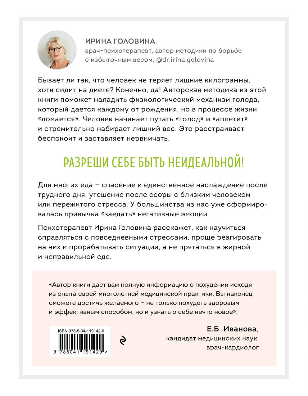 Очень редко, когда мы бываем полностью довольны своей внешностью. Всегда есть желание что-то изменить в жизни, в себе и, конечно же, похудеть. Ирина Головина, врач-психотерапевт с 30-летним стажем, за это время узнала о весе все, что возможно, и хочет научить тебя. Принимай себя, услышь сигналы своего тела, люби и заботься о душе и теле, ведь только в гармонии можно начать избавляться от лишнего веса и избежать срывов, при которых килограммы, с которыми распрощались мы с таким трудом, возвращаются порой в троекратном размере. Худей спокойно и без правил! Книга также выходит под вторым оформлением с названием «Я знаю о весе все».| Издательство | ООО "Издательство "Эксмо" |