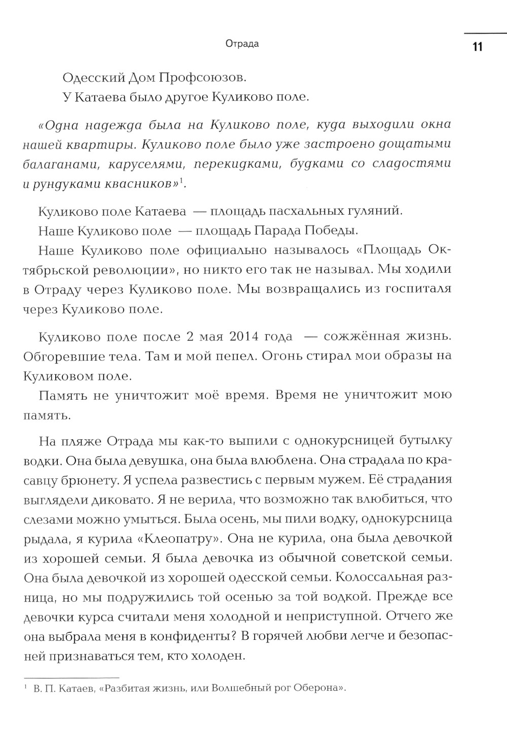 Я не знаю, что будет. Но я точно знаю, что было. Я родилась и выросла в Одессе. И я вольна возвращаться в Одессу в любое время. В любое время моей памяти. «Отрада» - это роман в эссе. В него вошли избранные эссе из книг «Мой одесский язык» и «Одесский фокстрот». И конечно же, я написала новые. Это путешествие в Одессу 70-80-х годов двадцатого века, в Одессу 2010-2012 годов. С 2014-го путь в город, где я родилась русской девочкой и выросла в русской семье, для меня закрыт. Но одно я могу сказать наверняка: это путешествие ещё не закончено.| Издательство | Феникс |