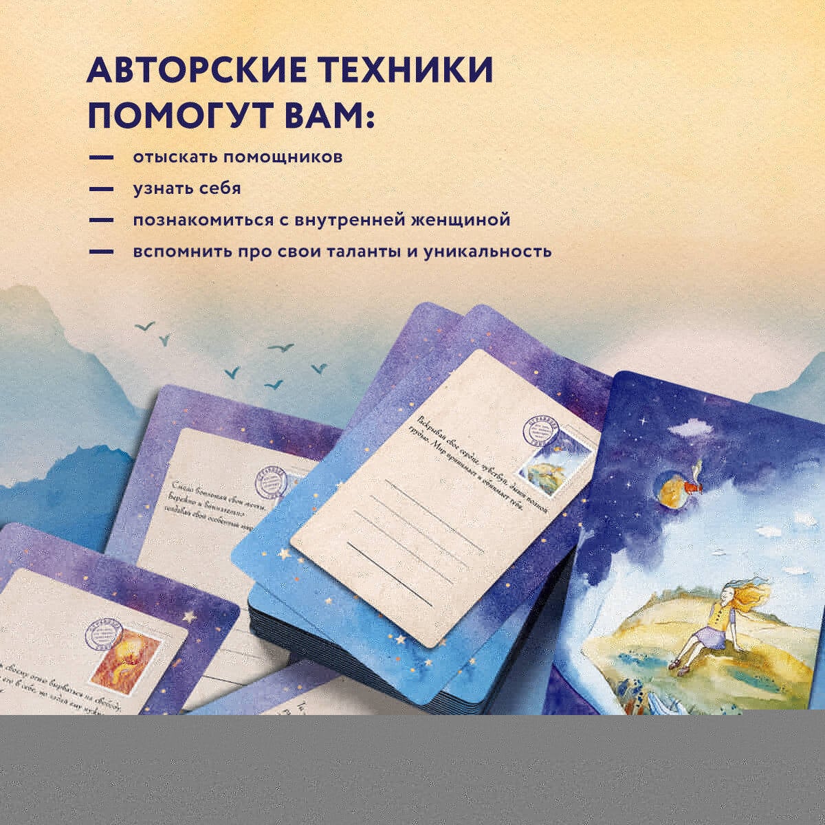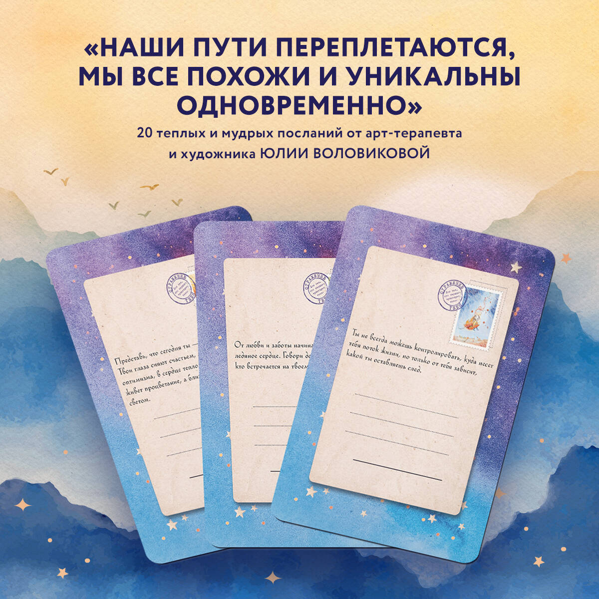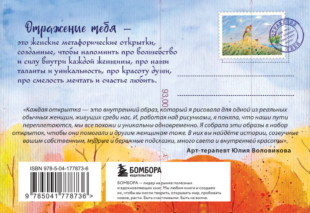 «Отражение Тебя» - это женские метафорические открытки, созданные, чтобы напомнить про волшебство и силу внутри каждой женщины, про наши таланты и уникальность, про красоту души, про смелость мечтать и счастье любить. «Каждая открытка - это внутренний образ, который я рисовала для одной из реальных обычных женщин, живущих среди нас. И, работая над рисунками, я поняла, что наши пути переплетаются, мы все похожи и уникальны одновременно. Я собрала эти образы в набор открыток, чтобы они помогали и другим женщинам тоже. В них вы найдёте истории, созвучные вашим собственным, мудрые и бережные подсказки, много света и внутренней красоты». - арт-терапевт Юлия Воловикова Открытки можно использовать для работы над собой и как вдохновляющий подарок на праздник для близкого человека. Внутри уникальные авторские техники работы с подсознанием, которые помогут вам: - отыскать свои помощников; - узнать, кто же вы на самом деле; - ближе познакомиться со своей внутренней женщиной. Открытки отпечатаны на плотном мелованном картоне с использованием уникальной технологии водного лакирования. «Порой нам всем нужна быстрая терапия, а эти карты - именно то, что нужно для того, чтобы получить ответ из глубин подсознания и понять, куда дальше плыть здесь и сейчас». - Сия, книжный блогер, @lowselfhome