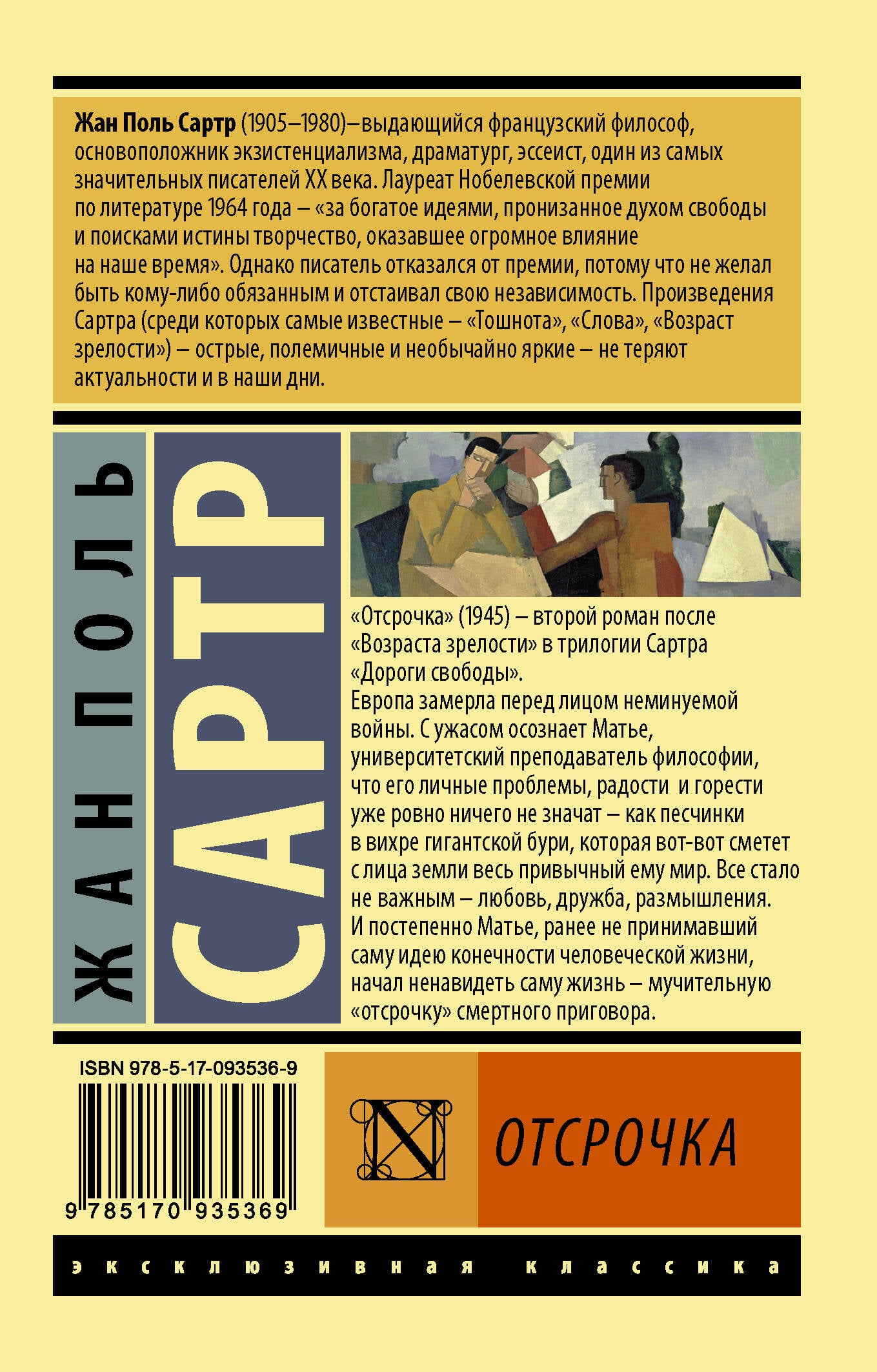 "Отсрочка" (1945) - второй роман после "Возраста зрелости" в трилогии Сартра "Дороги свободы". Европа замерла перед лицом неминуемой войны. С ужасом осознает Матье, университетский преподаватель философии, что его личные проблемы, радости и горести уже ровно ничего не значат - как песчинки в вихре гигантской бури, которая вот-вот сметет с лица земли весь привычный ему мир. Все стало не важным - любовь, дружба, размышления. И постепенно Матье, ранее не принимавший саму идею конечности человеческой жизни, начал ненавидеть саму жизнь - мучительную "отсрочку" смертного приговора.| Издательство | ИЗДАТЕЛЬСТВО "АСТ" |