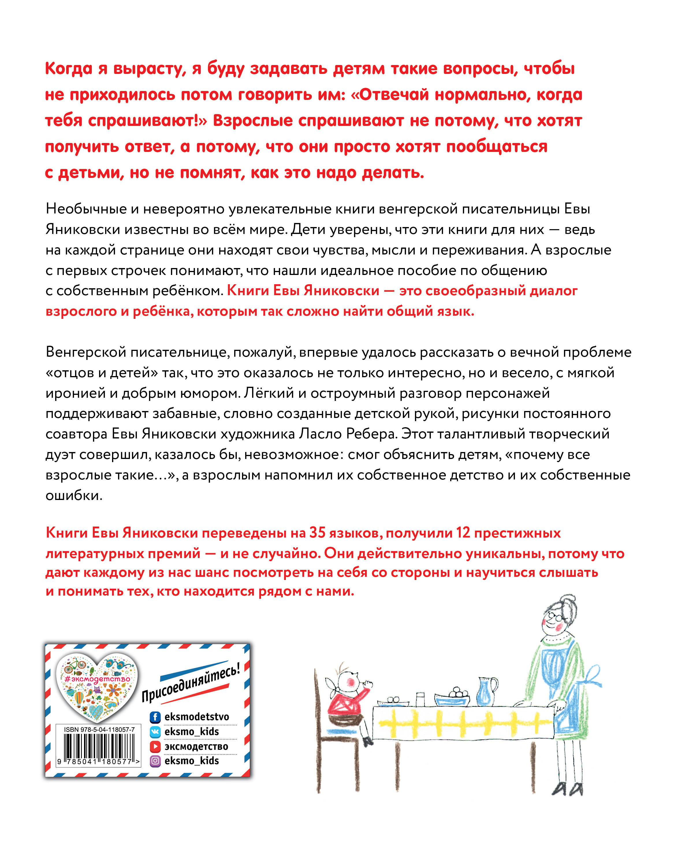 Книги венгерской писательницы Евы Яниковски, написанные от лица ребёнка и наполненные искрящимся юмором и лёгкой иронией, стали классикой детской литературы. Но их с большим удовольствием читают и взрослые, которым очень важно понять, чем живут и что чувствуют их дети. Главная особенность уникальных книг Евы Яниковски - это удивительная ёмкость и простота коротких текстов, которые с безупречной точностью раскрывают внутренний мир ребёнка. А кроме того, это своеобразный диалог на нестандартные темы между детьми и взрослыми, который помогает сократить разрыв между поколениями. Ева Яниковски окончила два университета: сначала в родном городе Сегеде, а затем - в Будапеште. Она изучала философию, этнографию, психологию, социологию и большую часть жизни посвятила работе с детьми и молодежью. Неудивительно, что её произведения переведены на тридцать пять языков и отмечены множеством престижнейших литературных премий и наград, в том числе Немецкой литературной молодежной премии. Писательница стала кавалером международного Ордена Улыбки, который присуждается известным людям, приносящим радость детям, а также была удостоена Офицерского креста ордена «За заслуги перед Венгерской Республикой». По мотивам её книг были поставлены детские спектакли, выпущено несколько мультфильмов. Неизменным иллюстратором книг Евы Яниковски был венгерский художник Ласло Ребер, лауреат Немецкой молодежной литературной премии и премии имени Г.-Х. Андерсена, а также обладатель многих других наград. Именно Л. Реберу удалось наиболее достоверно передать в своих работах внутренний мир ребёнка.| Издательство | ООО "Издательство "Эксмо" |