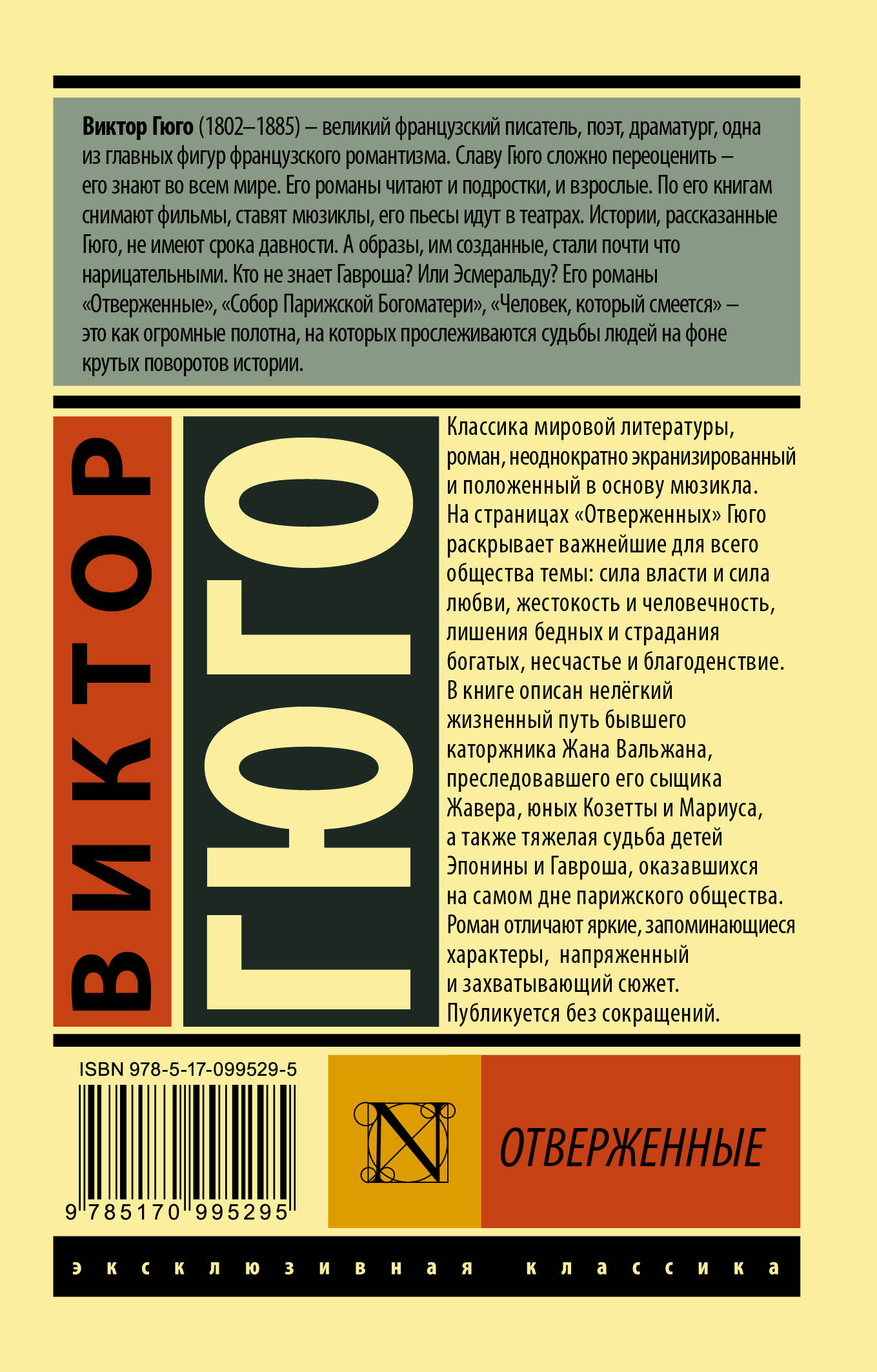 Классика мировой литературы, роман, неоднократно экранизированный и положенный в основу мюзикла. На страницах "Отверженных" Гюго раскрывает важнейшие для всего общества темы: сила власти и сила любви, жестокость и человечность, лишения бедных и страдания богатых, несчастье и благоденствие. В книге описан нелёгкий жизненный путь бывшего каторжника Жана Вальжана, преследовавшего его сыщика Жавера, юных Козетты и Мариуса, а также тяжелая судьба детей Эпонины и Гавроша, оказавшихся на самом дне парижского общества. Роман отличают яркие, запоминающиеся характеры, гротеск и романтика, напряженный и захватывающий сюжет. Публикуется без сокращений.| Издательство | ИЗДАТЕЛЬСТВО "АСТ" |