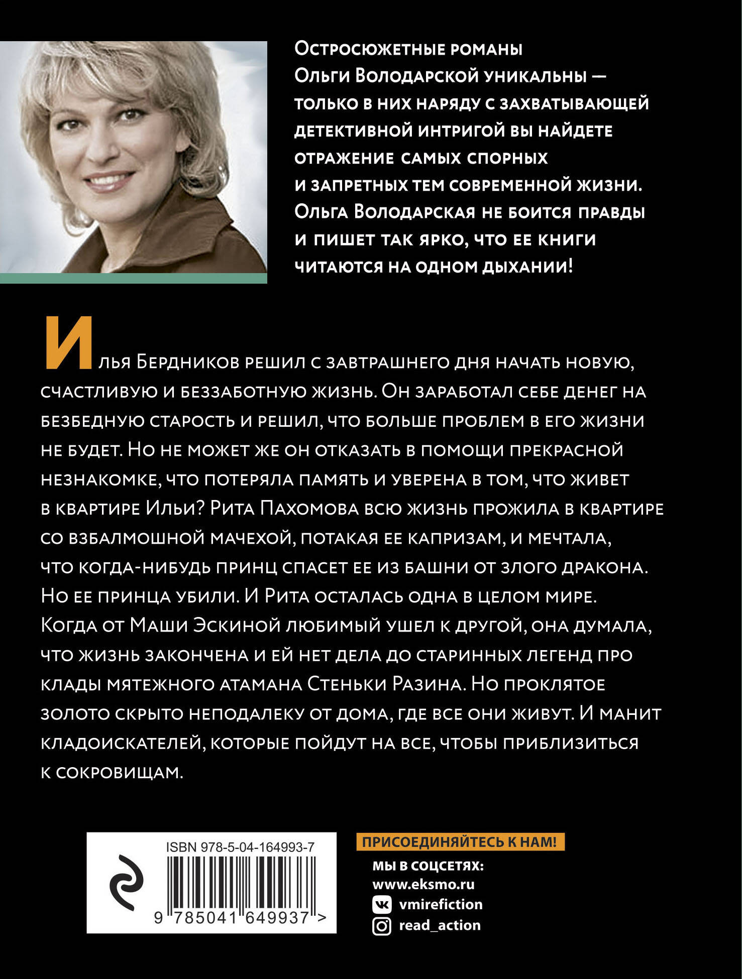 Это был не просто шикарный высотный дом. Построенный в сталинские времена для элиты, он до сих пор оставался самым престижным в городе. Старожилы назвали его «шпилькой», но журналисты окрестили «мавзолеем» после того, как в подвале были обнаружены останки архитектора, якобы пропавшего без вести в разгар строительства. Они же разнесли весть о проклятии «мавзолея»… Богатый холостяк Илья Бердников не верил желтой прессе, поэтому без опасений приобрел квартиру в высотке. И спокойно прожил в ней четыре года, пока не познакомился с Лизой. Девушка сидела у его порога с раной на голове, она ничего не помнила, кроме своего имени и того, что когда-то жила в квартире Ильи. Бердников не смог отказать ей в помощи, несмотря на то что во дворе незадолго до их знакомства убили мужчину и Лиза может быть причастна к этому… Романы Ольги Володарской - остросоциальные детективы, в которых автор препарирует все стороны жизни современного общества, ничего не скрывая и ни о чем не умалчивая. Ее книги написаны так увлекательно, что оторваться просто невозможно. Яркий сочный язык и блестящий авторский стиль создают неповторимую атмосферу, в которую с головой погружается читатель.| Издательство | Эксмо |
