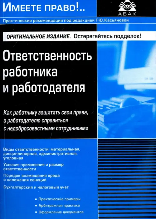Впервые в отечественной практике в одной книге собраны правила применения различных видов ответственности работника перед работодателем и работодателя перед работником и государством. В ней на конкретных практических примерах объясняется, когда и чья наступает ответственность, какие документы должны оформляться в различных ситуациях, как применение материальной ответственности отражается в учете (бухгалтерском и налоговом), рассматриваются сложные случаи, приводятся примеры из арбитражной практики. Кроме того, в этой книге вы найдете образцы всех необходимых вам документов, а также рекомендации по их составлению. Материалы подготовлены с использованием системы ГАРАНТ. Издание адресовано всем работающим гражданам, а также юристам, практикующим бухгалтерам и руководителям организаций, аудиторам, студентам и преподавателям экономических и правовых факультетов и всем заинтересованным лицам. 4-е издание, переработанное и дополненное.