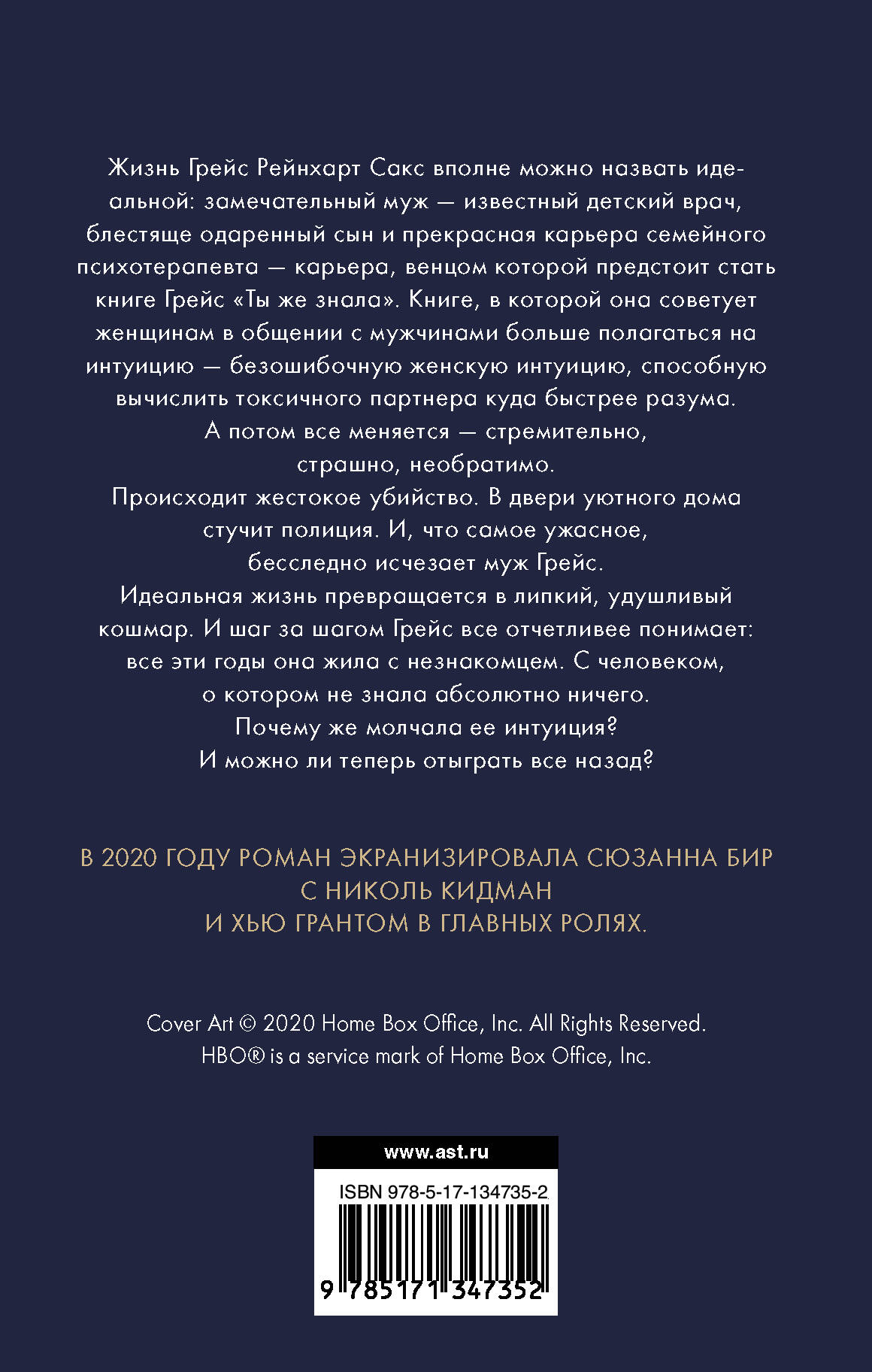 Жизнь Грейс Рейнхарт Сакс вполне можно назвать идеальной: замечательный муж - известный детский врач, блестяще одаренный сын и прекрасная карьера семейного психотерапевта - карьера, венцом которой предстоит стать книге Грейс "Ты же знала". Книге, в которой она советует женщинам в общении с мужчинами больше полагаться на интуицию - безошибочную женскую интуицию, способную вычислить токсичного партнера куда быстрее разума. А потом все меняется - стремительно, страшно, необратимо. Происходит жестокое убийство. В двери уютного дома стучит полиция. И, что самое ужасное, бесследно исчезает муж Грейс. Идеальная жизнь превращается в липкий, удушливый кошмар. И шаг за шагом Грейс все отчетливее понимает: все эти годы она жила с незнакомцем. С человеком, о котором не знала абсолютно ничего. Почему же молчала ее интуиция? И можно ли теперь отыграть все назад?| Издательство | ИЗДАТЕЛЬСТВО "АСТ" |
