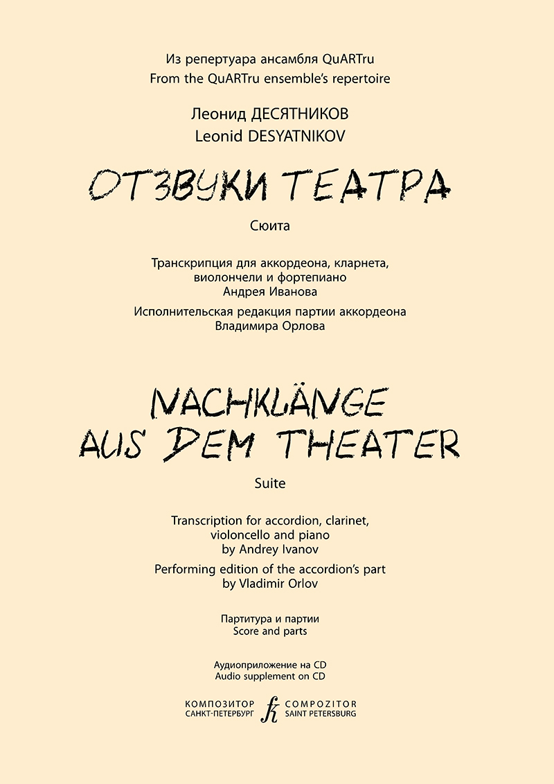 Аннотация: Отзвуки театра. Сюита. Транскрипция для аккордеона, кларнета, виолончели и фп. Партитура и партии +CD