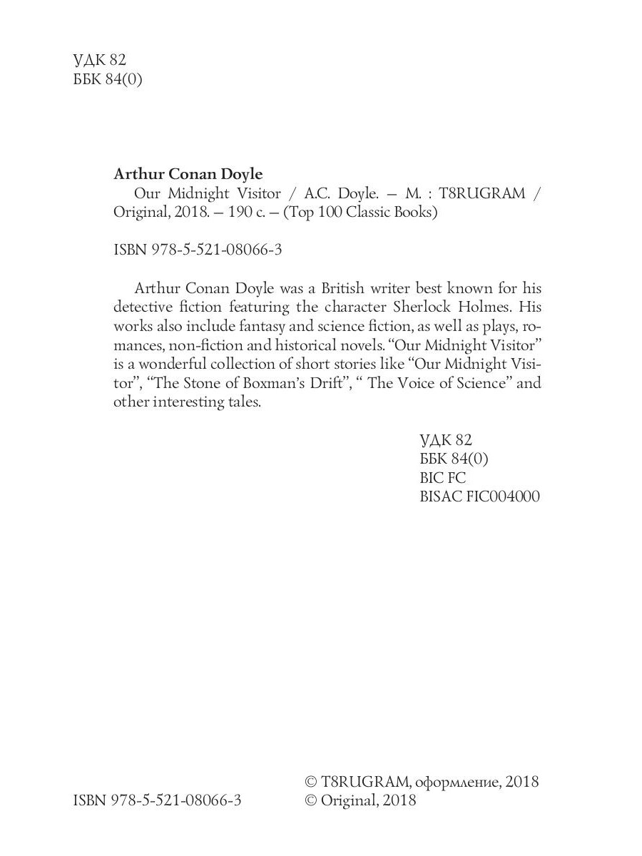 Arthur Conan Doyle was a British writer best known for his detective fiction featuring the character Sherlock Holmes. His works also include fantasy and science fiction, as well as plays, romances, non-fiction and historical novels. "Our Midnight Visitor" is a wonderful collection of short stories like "Our Midnight Visitor", "The Stone of Boxman's Drift", " The Voice of Science" and other interesting tales.