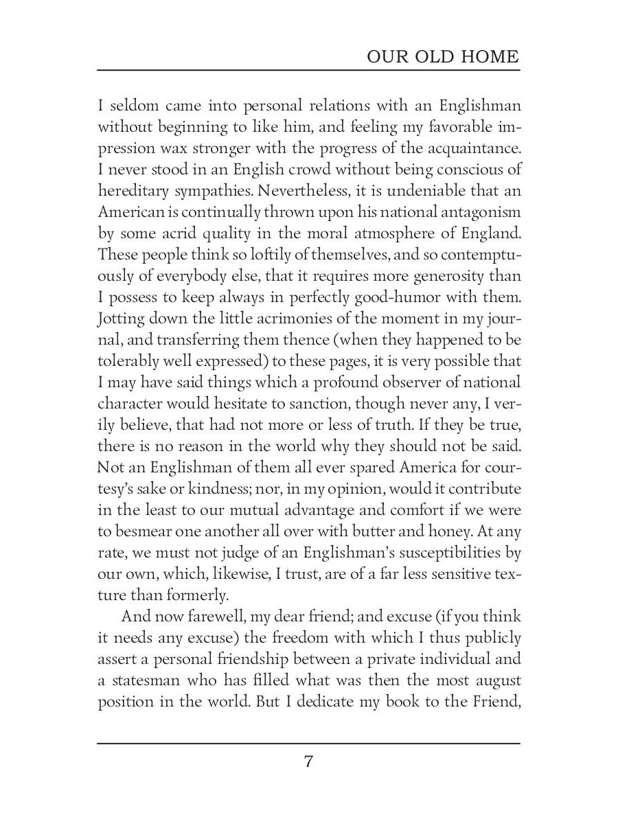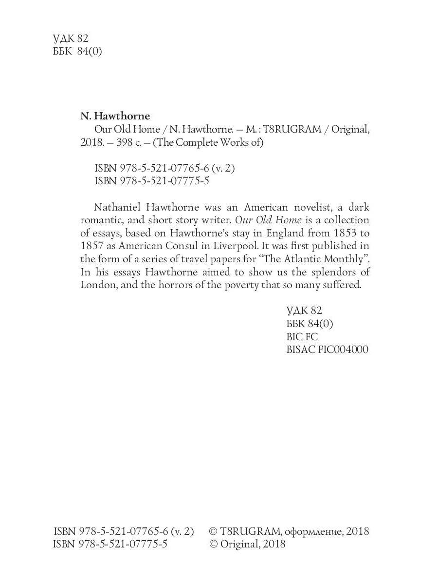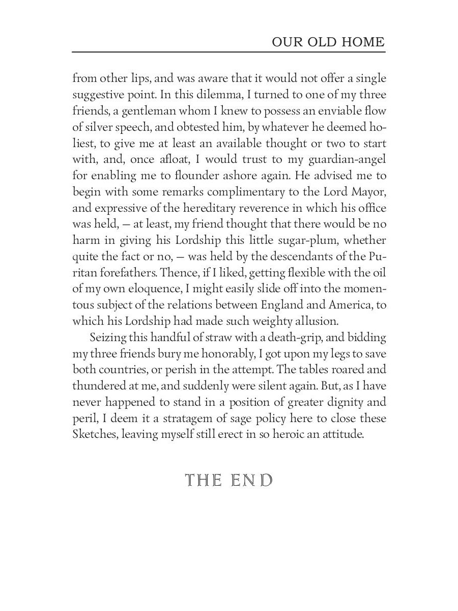 Nathaniel Hawthorne was an American novelist, a dark romantic, and short story writer. Our Old Home is a collection of essays, based on Hawthorne's stay in England from 1853 to 1857 as American Consul in Liverpool. It was first published in the form of a series of travel papers for "The Atlantic Monthly". In his essays Hawthorne aimed to show us the splendors of London, and the horrors of the poverty that so many suffered.