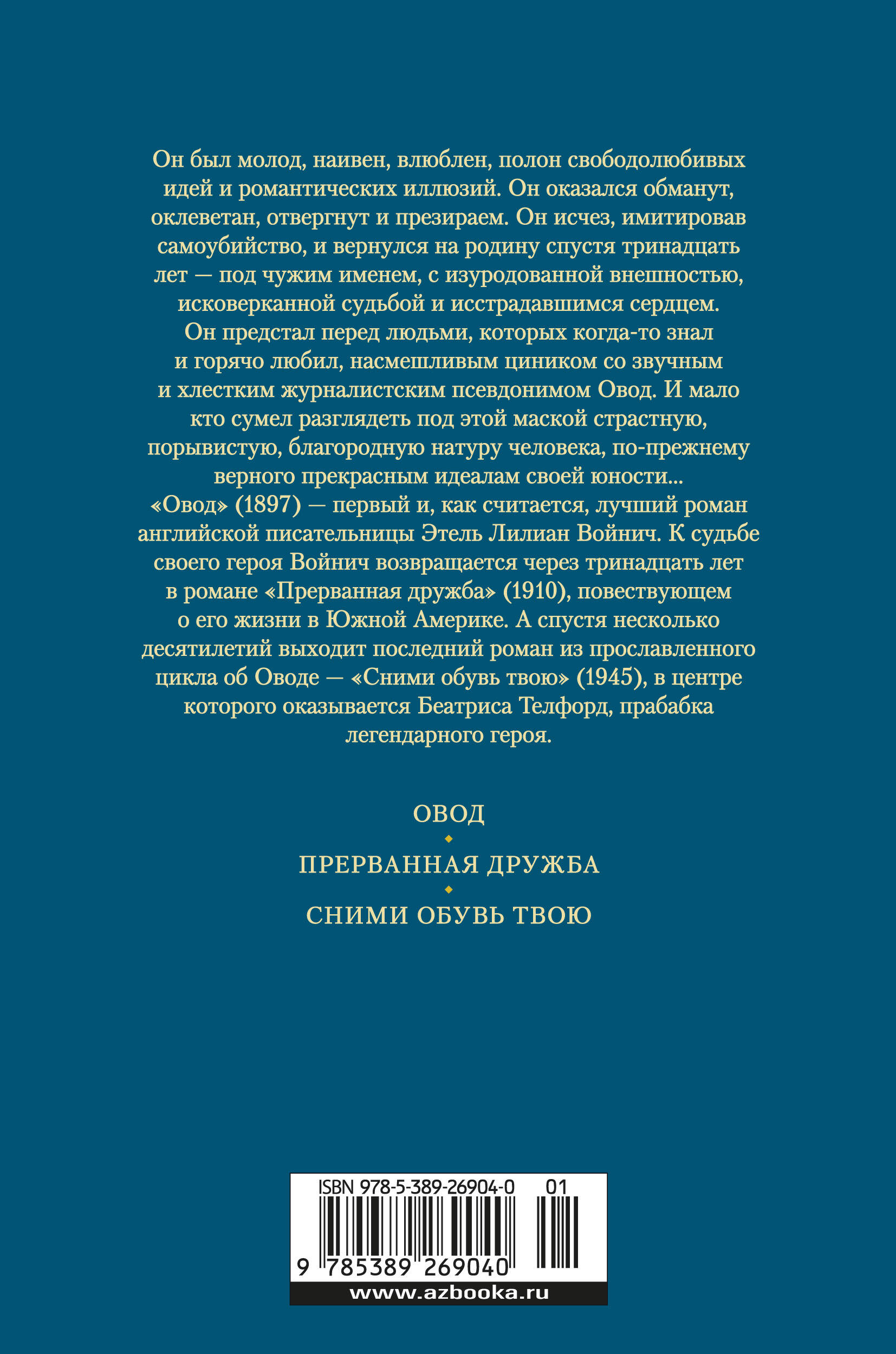 Он был молод, наивен, влюблен, полон свободолюбивых идей и романтических иллюзий. Он оказался обманут, оклеветан, отвергнут и презираем. Он исчез, имитировав самоубийство, и вернулся на родину спустя тринадцать лет - под чужим именем, с изуродованной внешностью, исковерканной судьбой и исстрадавшимся сердцем. Он предстал перед людьми, которых когда-то знал и горячо любил, насмешливым циником со звучным и хлестким журналистским псевдонимом Овод. И мало кто сумел разглядеть под этой маской страстную, порывистую, благородную натуру человека, по-прежнему верного прекрасным идеалам своей юности... "Овод" (1897) - первый и, как считается, лучший роман английской писательницы Этель Лилиан Войнич. К судьбе своего героя Войнич возвращается через тринадцать лет в романе "Прерванная дружба" (1910), повествующем о его жизни в Южной Америке. А спустя несколько десятилетий выходит последний роман из прославленного цикла об Оводе - "Сними обувь твою" (1945), в центре которого оказывается Беатриса Телфорд, прабабка легендарного героя.| Издательство | Азбука-Аттикус Издат.группа ООО |