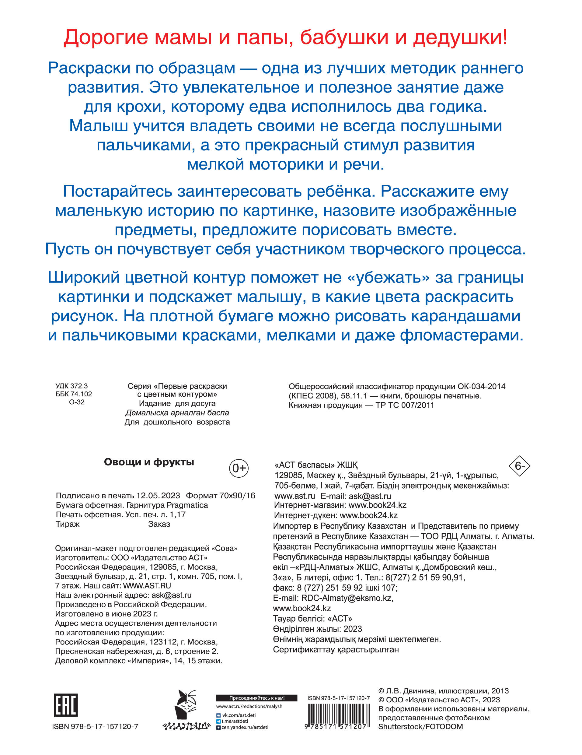 Развивающая раскраска «Овощи и фрукты» - прекрасный подарок для маленьких художников, которые только учатся держать в руке карандаш или фломастер. Это крупные картинки с широким цветным контуром и образцами для раскрашивания. Малыш разовьёт мелкую моторику и координацию движений руки, внимание.| Издательство | ИЗДАТЕЛЬСТВО "АСТ" |