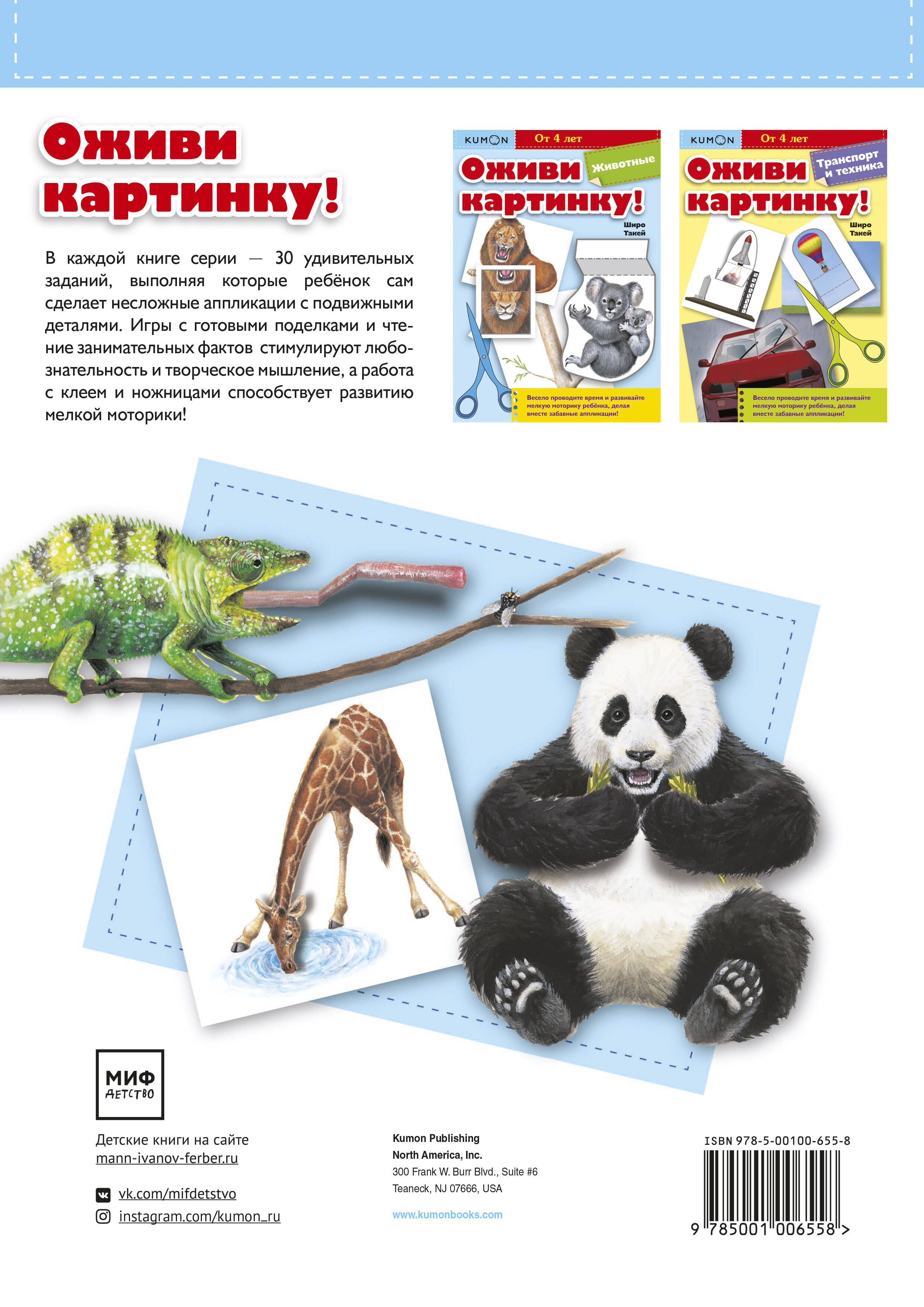 "Оживи картинку! Животные" - это рабочая тетрадь для развития мелкой моторики и творческого мышления. Внутри 30 заданий, в каждом из которых нужно сделать аппликацию с подвижными элементами. Чтение описаний к картинкам и игры с готовыми поделками будут стимулировать любознательность ребёнка, а вырезание, складывание и приклеивание деталей, поможет ему совершенствовать навыки работы с ножницами и клеем. Тетрадь предназначена для занятий с детьми от четырёх лет.| Издательство | Манн, Иванов и Фербер |