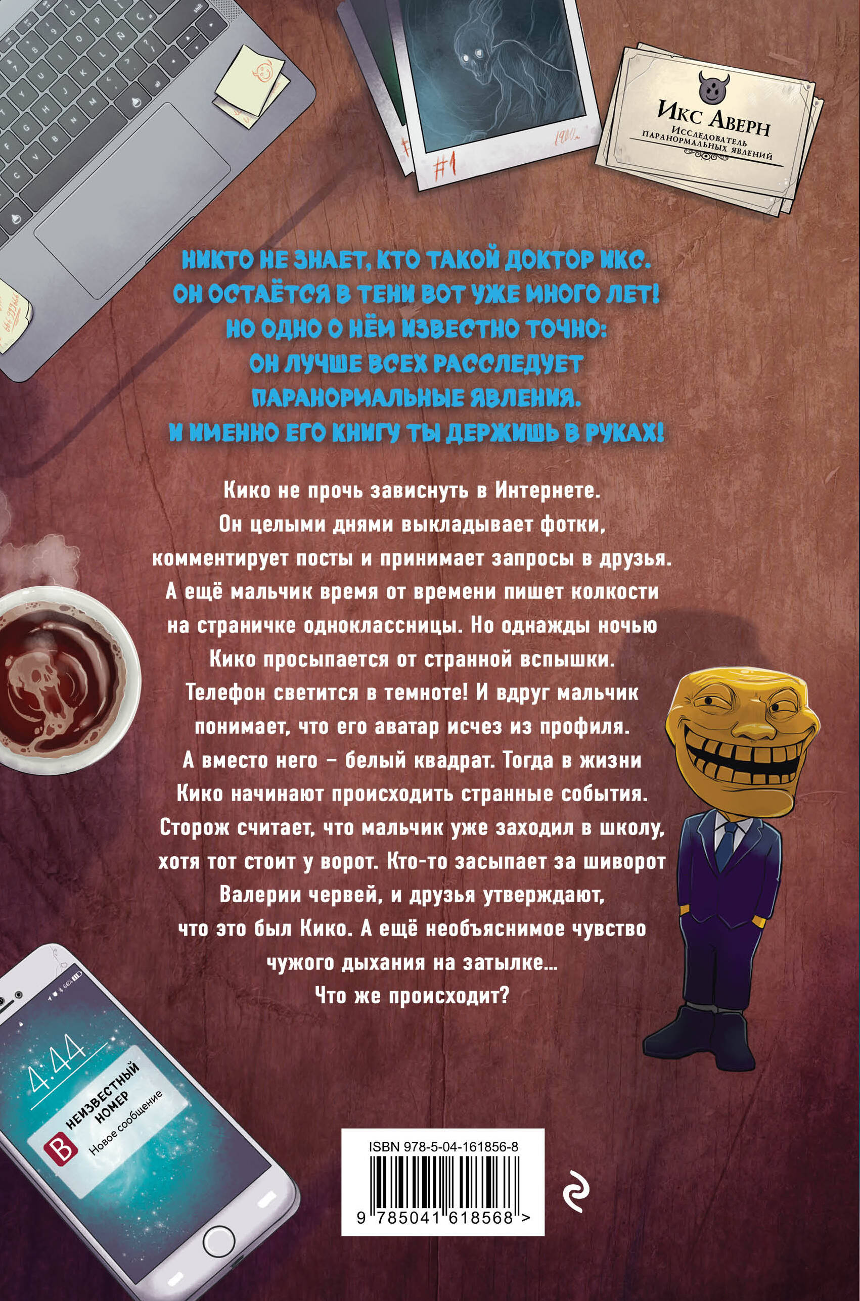 Кико ни дня не может прожить без телефона! Он постоянно строчит комментарии, выкладывает фотки и чатится с друзьями. Но однажды всё меняется: во время страшной грозы аватар Кико сбегает из профиля. Он очень опасен и хочет занять место мальчика в реальной жизни. Что же делать? Атмосферная история для любителей тайн и сверхъестественных явлений! Интересный сюжет держит в напряжении до последней страницы. Рассказчик - загадочный доктор Икс Аверн, который сохраняет инкогнито. Кто же он такой? И откуда знает столько о мистическом и необъяснимом? Каждая история в серии - самостоятельная, читай любую. Книгу дополняют чёрно-белые иллюстрации, комментарии из соцсетей и электронные письма.