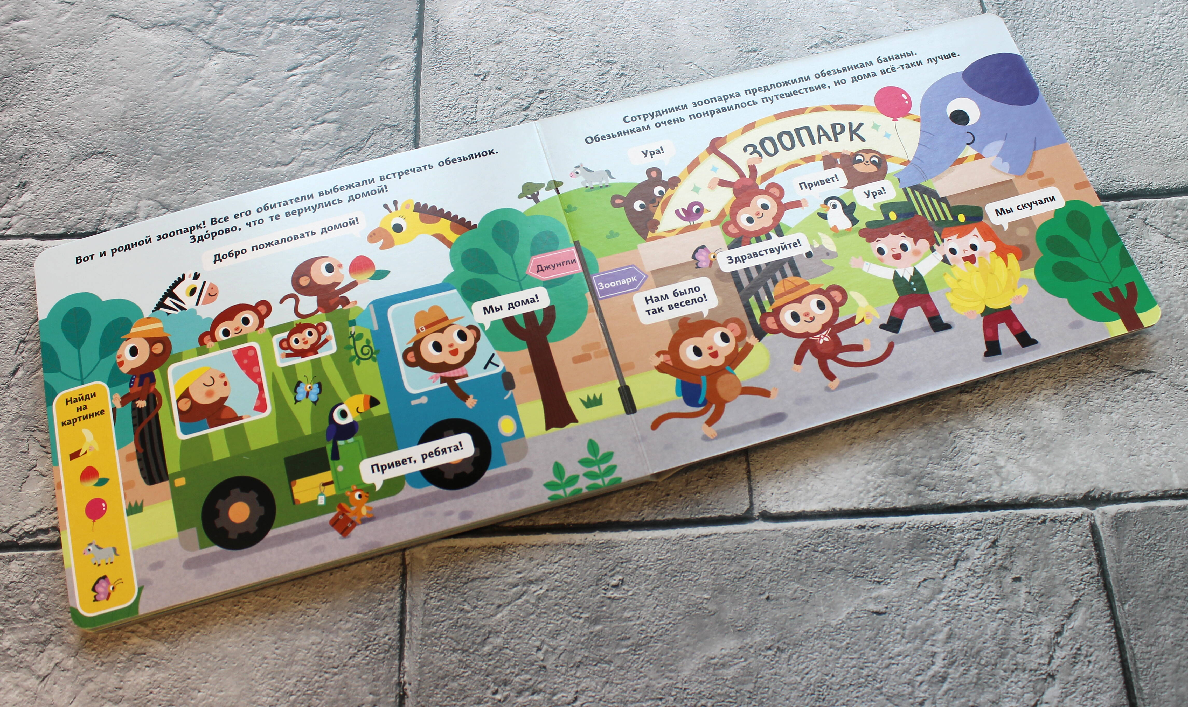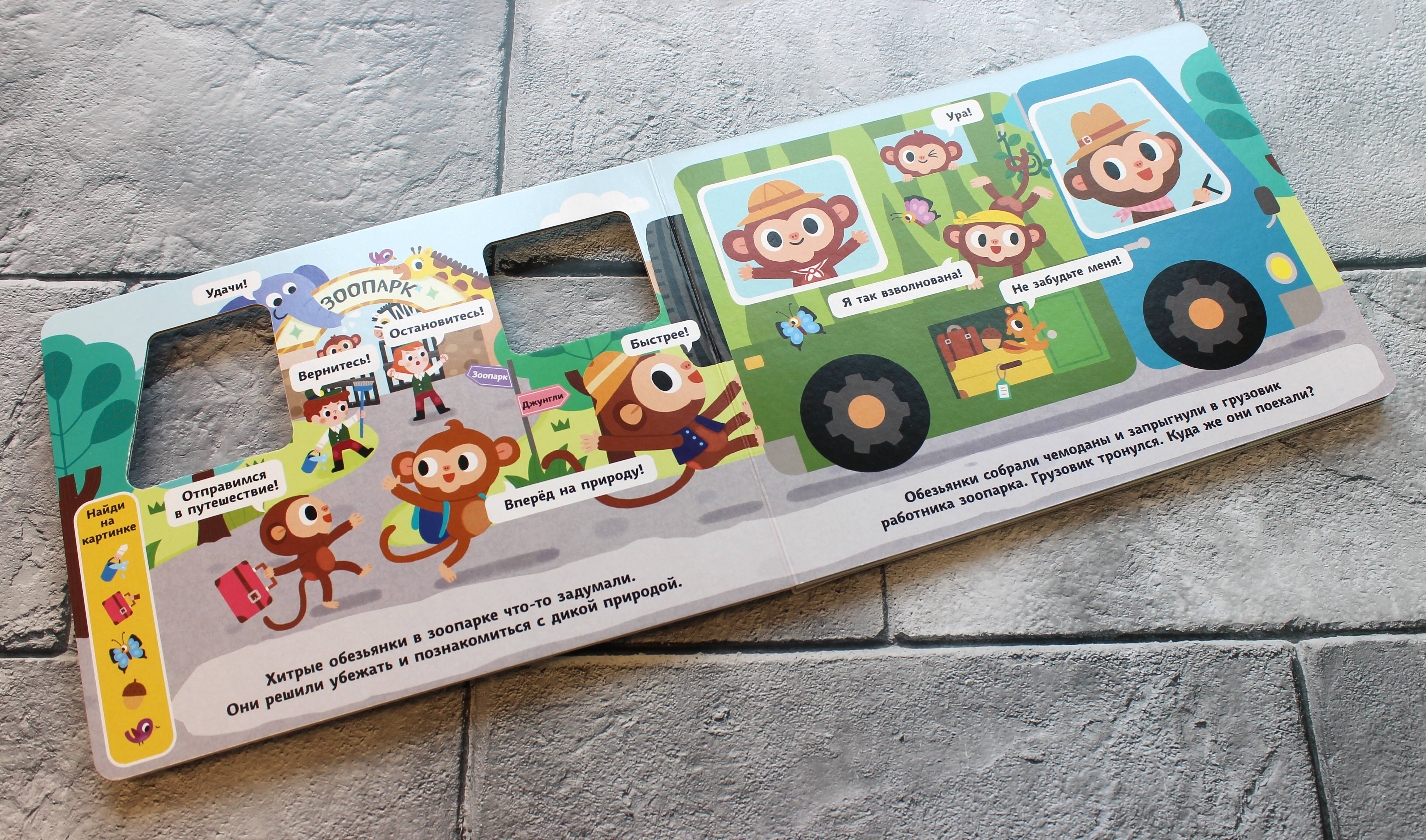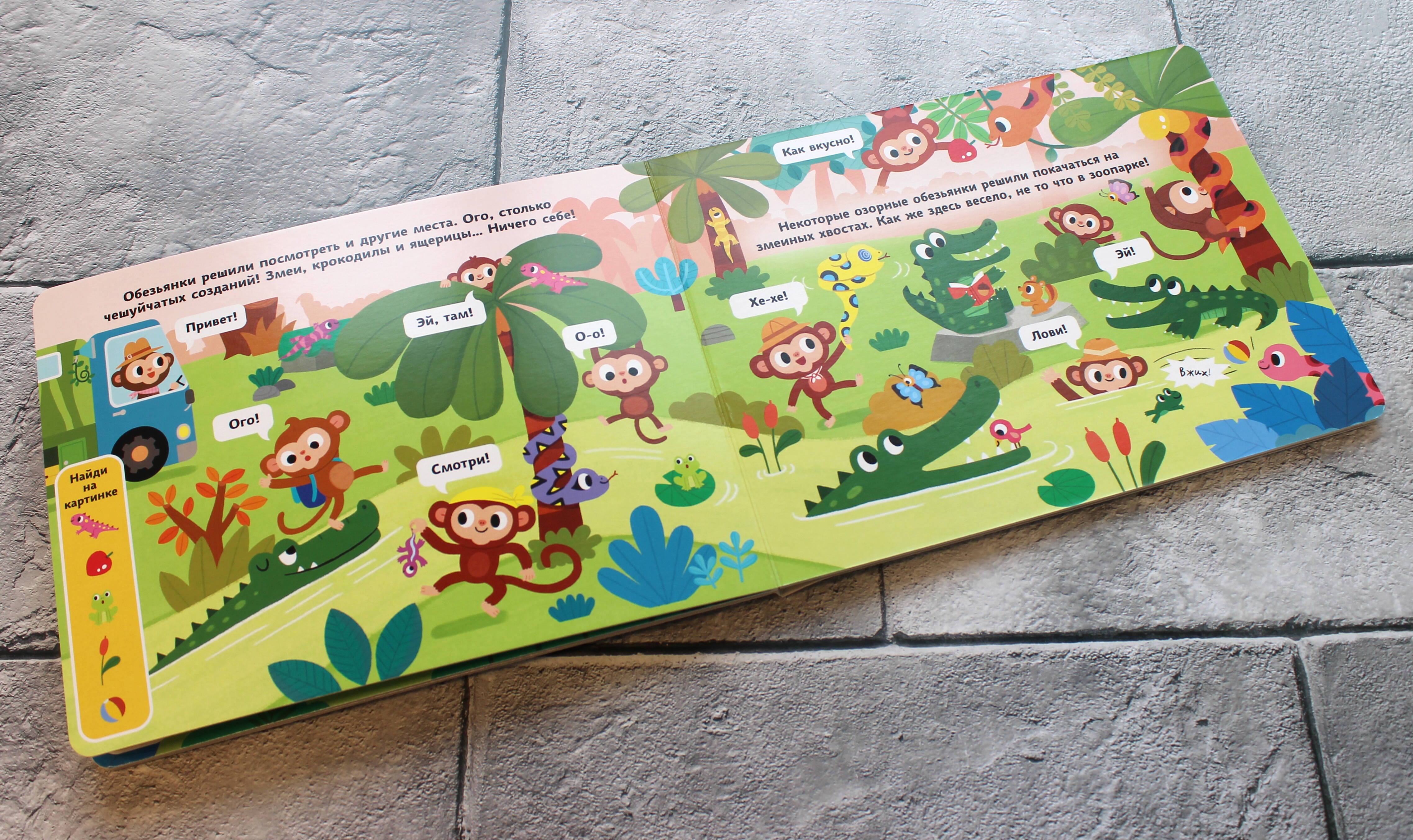 Хитрые обезьянки задумали сбежать из зоопарка и познакомиться с дикой природой. Вместе с ними мы познакомимся с дружелюбными леопардами, львами и тиграми, покачаемся на змеиных хвостах, прокатимся на крокодиле и поиграем вместе с весёлыми туканами, попугаями и фламинго. КНИЖКИ-НАХОДИЛКИ На каждом развороте вас ждут спрятанные на картинке предметы. Читайте историю, ищите предметы и находите их вместе с ребёнком. КНИЖКИ-ОБУЧАЛКИ А ещё можно рассматривать иллюстрации и считать предметы, сравнивать их по цвету и размеру, описывать, что делает каждый из героев. КНИЖКИ-КУСАЛКИ Книжки изготовлены из плотного целлюлозного картона, покрытого специальным защитным слоем, поэтому полностью безопасны для здоровья малыша. Кроме того, они имеют скруглённые уголки, которые не позволят маленьким деткам пораниться. КНИЖКИ-РАЗВИВАЙКИ Серия книжек-картонок «Весёлые окошки» поможет развить внимание, наблюдательность и усидчивость, а также увеличить активный и пассивный словарный запас вашего малыша.