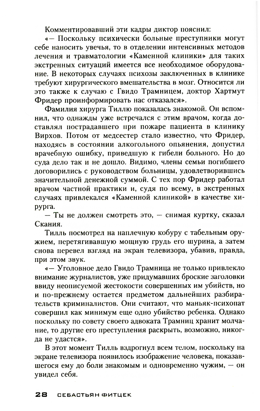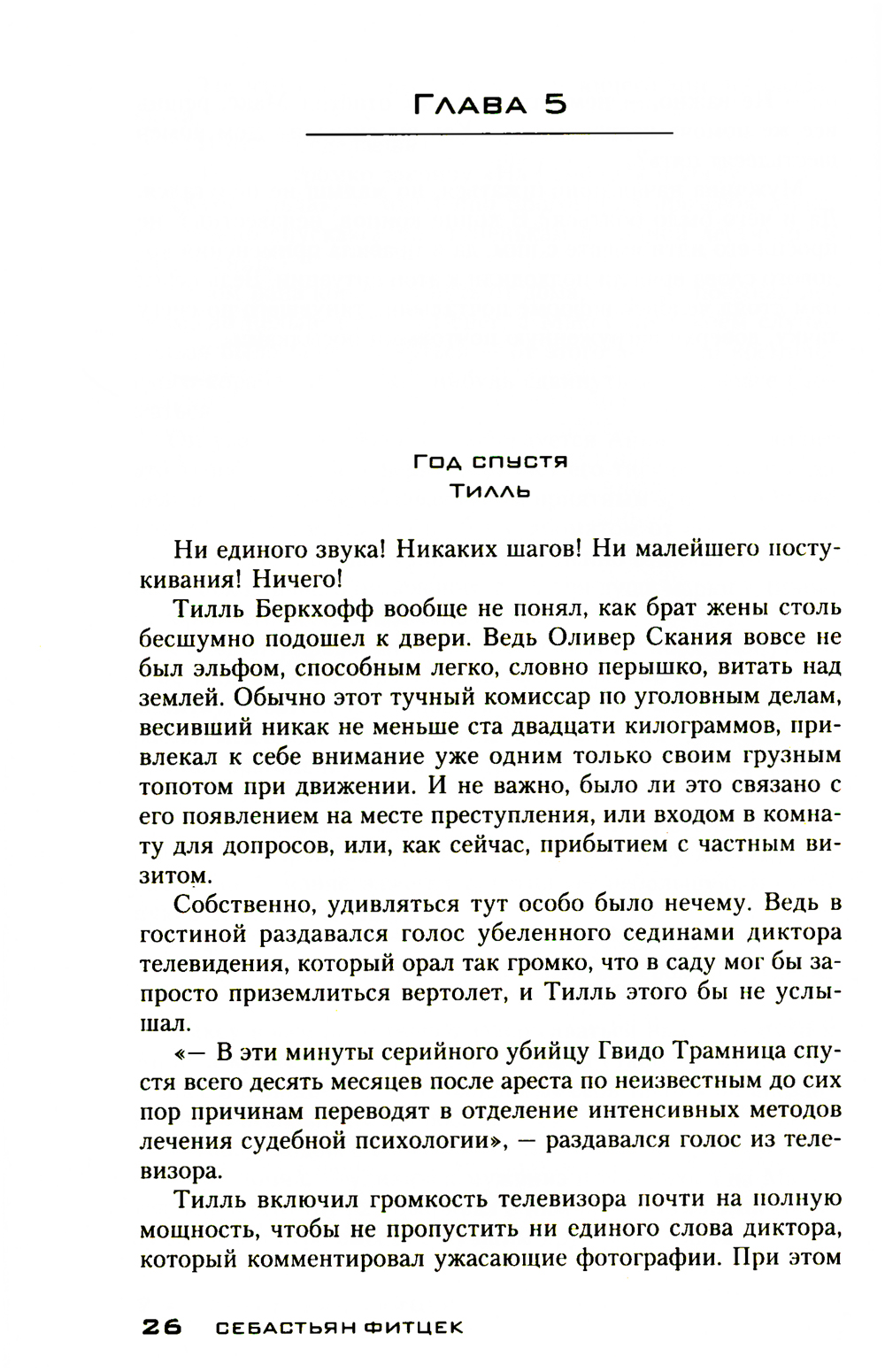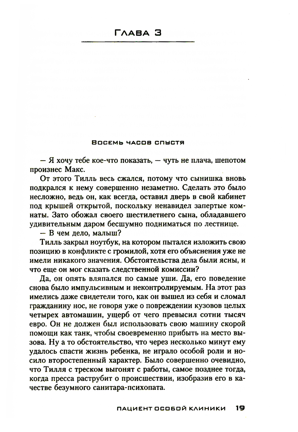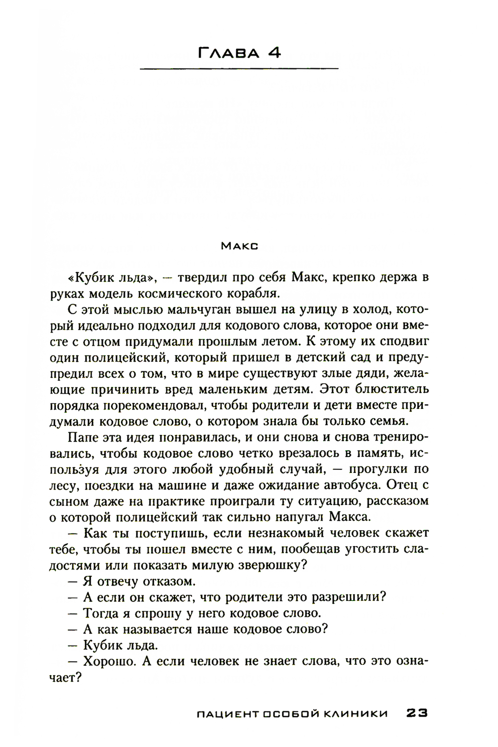 У Тилля Беркхоффа бесследно пропадает сын Макс. Все улики свидетельствуют о том, что мальчик стал жертвой маньяка Гвидо Трамница. Преступник арестован полицией и признался в похищении и убийстве нескольких маленьких детей. Место их захоронения серийный убийца указал, однако о судьбе Макса хранит упорное молчание. Суд признает садиста невменяемым и отправляет его в строго охраняемую психиатрическую лечебницу. Следствию известно о том, что психопат вел дневник, где описывал все, что сделал с жертвами, но найти записи не удалось. Отчаявшийся отец обращается за содействием к знакомому сотруднику полиции, и тот делает ему невероятное предложение: стать пациентом этой особой клиники. Так он сможет оказаться ближе к детоубийце и заставить его признаться. Того, чем обернется эта отчаянная попытка, не ожидал никто.| Издательство | Центрполиграф |