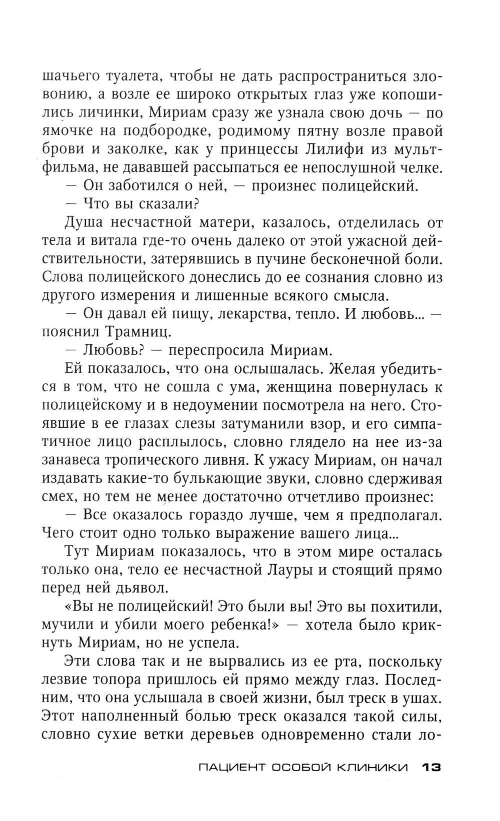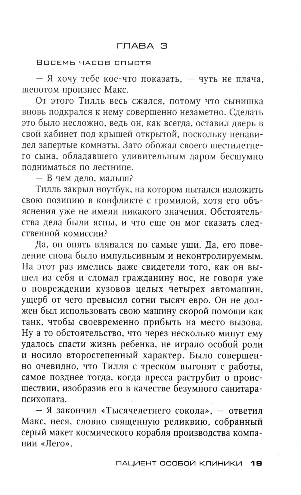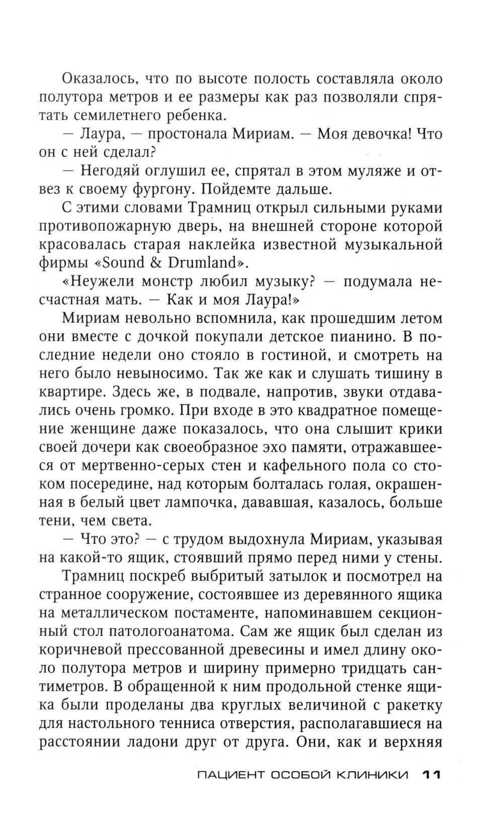 У Тилля Беркхоффа бесследно пропадает сын Макс. Все улики свидетельствуют о том, что мальчик стал жертвой маньяка Гвидо Трамница. Преступник арестован полицией и признался в похищении и убийстве нескольких маленьких детей. Место их захоронения серийный убийца указал, однако о судьбе Макса хранит упорное молчание. Суд признает садиста невменяемым и отправляет его в строго охраняемую психиатрическую лечебницу. Следствию известно о том, что психопат вел дневник, где описывал все, что сделал с жертвами, но найти записи не удалось. Отчаявшийся отец обращается за содействием к знакомому сотруднику полиции, и тот делает ему невероятное предложение: стать пациентом этой особой клиники. Так он сможет оказаться ближе к детоубийце и заставить его признаться. Того, чем обернется эта отчаянная попытка, не ожидал никто.| Издательство | Центрполиграф |