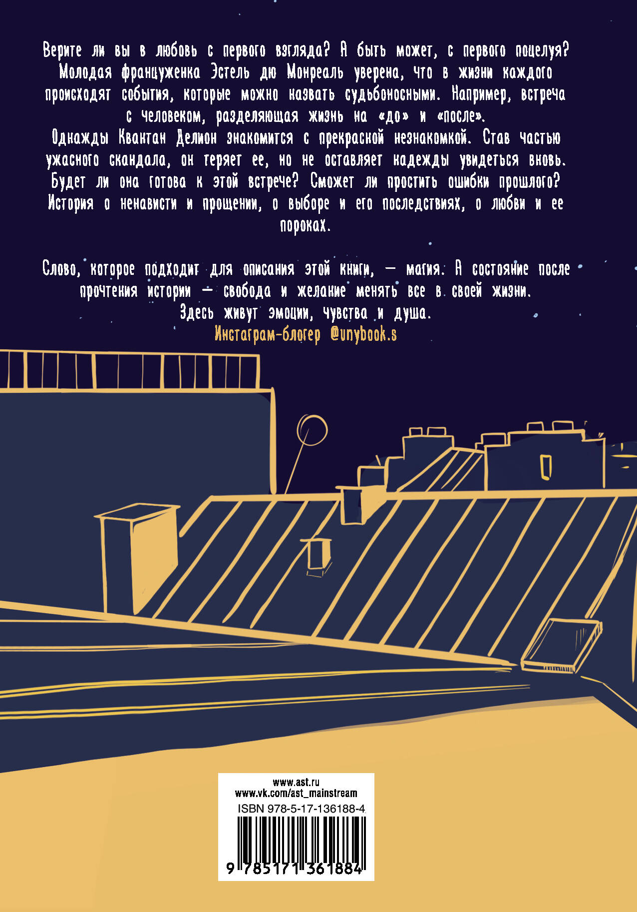 Верите ли вы в любовь с первого взгляда? А быть может, с первого поцелуя? Молодая француженка Эстель дю Монреаль уверена, что в жизни каждого происходят события, которые можно назвать судьбоносными. Например, встреча с человеком, разделяющая жизнь на "до" и "после". Однажды Квантан Делион знакомится с прекрасной незнакомкой. Став частью ужасного скандала, он теряет ее, но не оставляет надежды увидеться вновь. Будет ли она готова к этой встрече? Сможет ли простить ошибки прошлого? История о ненависти и прощении, о выборе и его последствиях, о любви и ее пороках.| Издательство | Издательство "АСТ" |