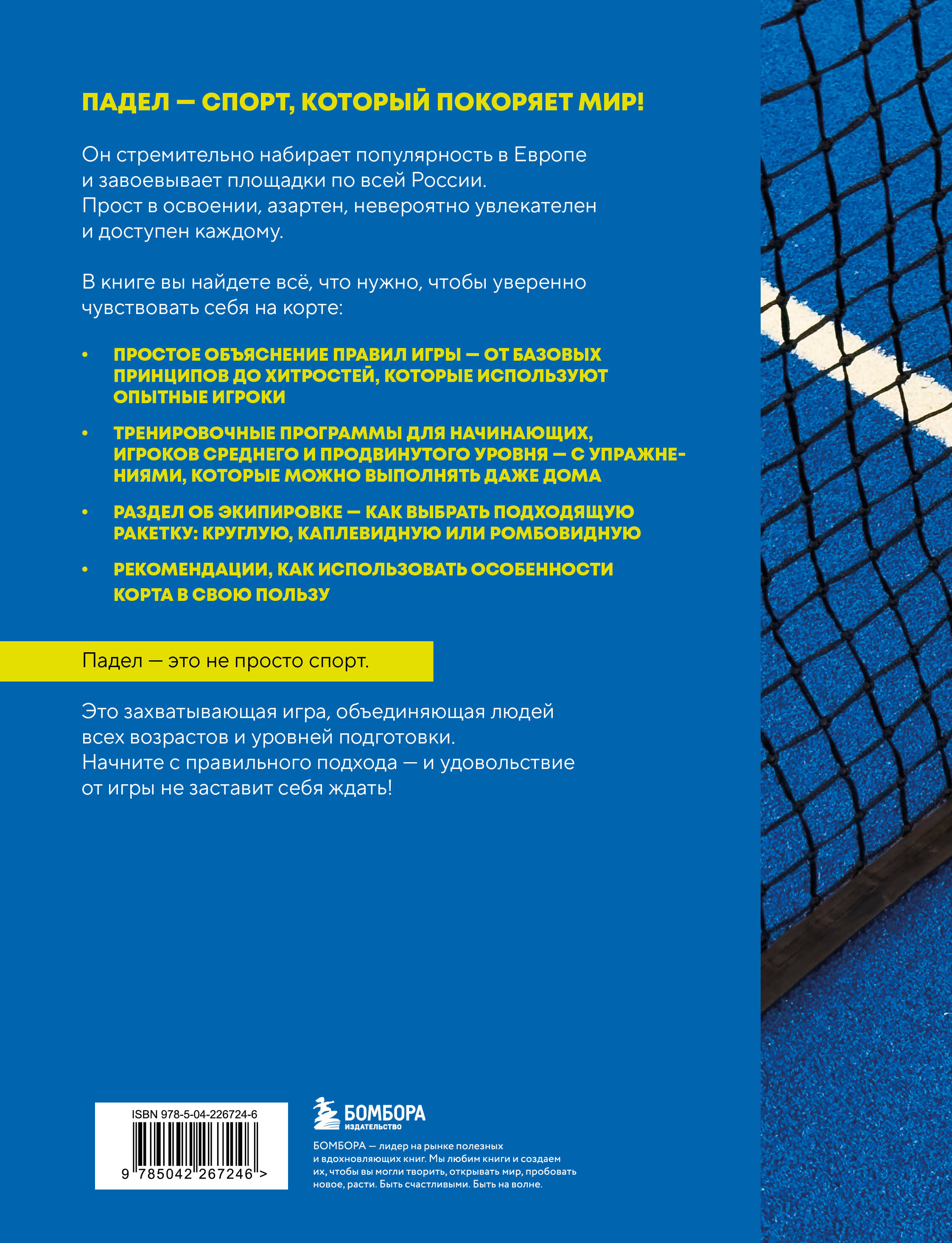 Падел - спорт, который покоряет мир! Он стремительно набирает популярность в Европе и завоевывает площадки по всей России. Прост в освоении, азартен, невероятно увлекателен и доступен каждому. В книге вы найдете всё, что нужно, чтобы уверенно чувствовать себя на корте: -простое объяснение правил игры - от базовых принципов до хитростей, которые используют опытные игроки; -тренировочные программы для начинающих, игроков среднего и продвинутого уровня - с упражнениями, которые можно выполнять даже дома; -раздел об экипировке - как выбрать подходящую ракетку: круглую, каплевидную или ромбовидную; -рекомендации, как использовать особенности корта в свою пользу; Падел - это не просто спорт. Это захватывающая игра, объединяющая людей всех возрастов и уровней подготовки. Начните с правильного подхода - и удовольствие от игры не заставит себя ждать!| Издательство | ООО "Издательство "Эксмо" |