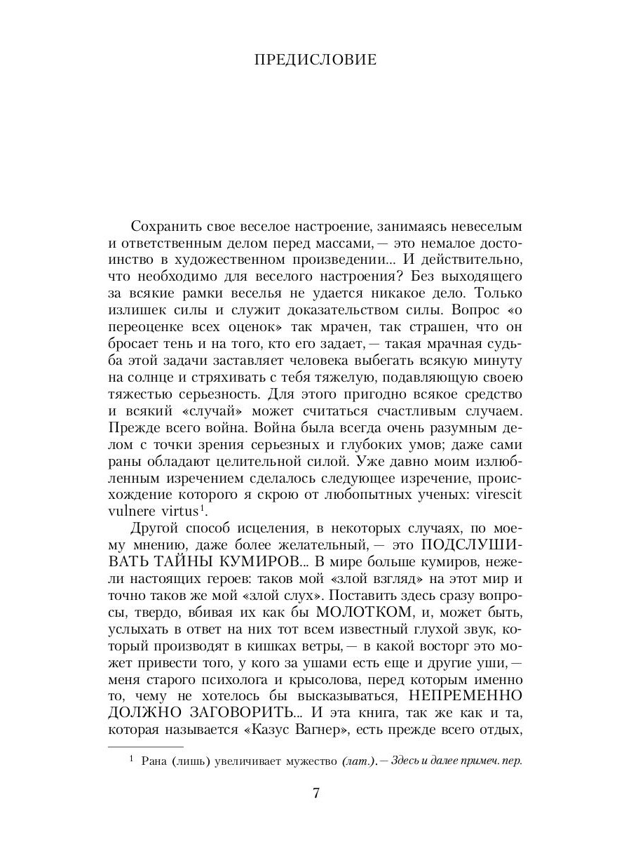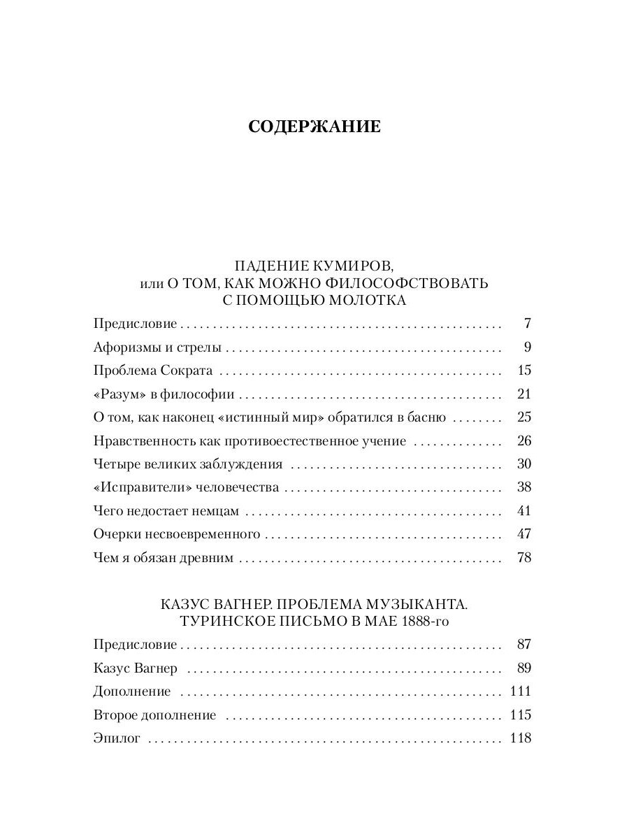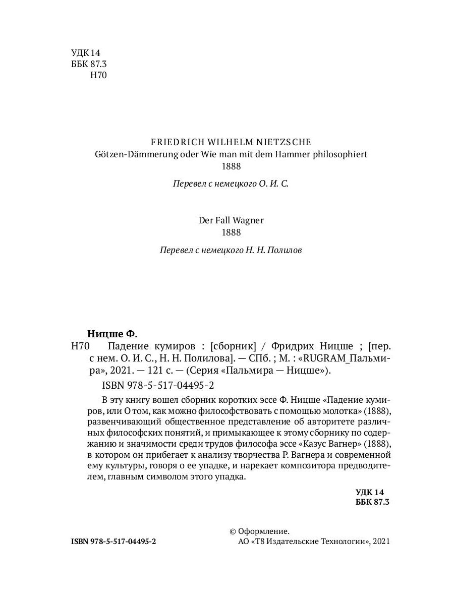В эту книгу вошел сборник коротких эссе Ф. Ницше «Падение кумиров, или О том, как можно философствовать с помощью молотка» (1888), развенчивающий общественное представление об авторитете различных философских понятий, и примыкающее к этому сборнику по содержанию и значимости среди трудов философа эссе «Казус Вагнер» (1888), в котором он прибегает к анализу творчества Р. Вагнера и современной ему культуры, говоря о ее упадке, и нарекает композитора предводителем, главным символом этого упадка.| Издательство | Т8 RUGRAM |