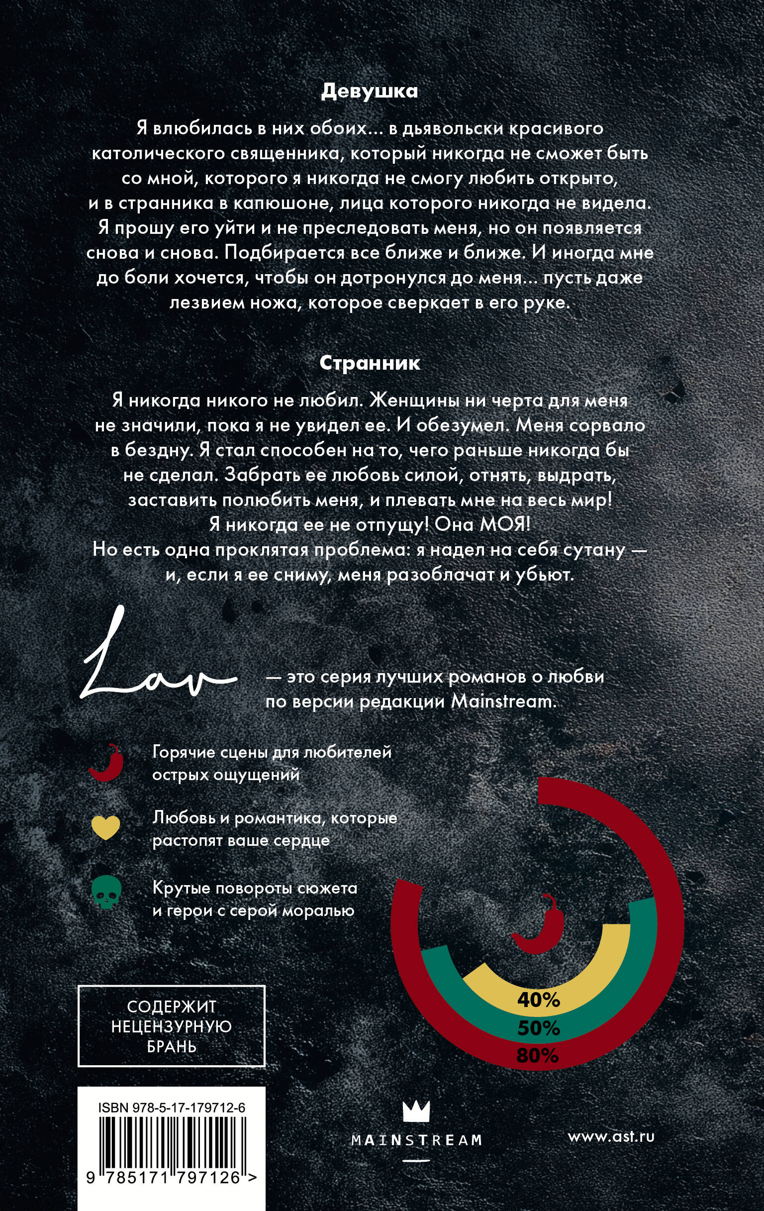 Девушка Я влюбилась в них обоих… в дьявольски красивого католического священника, который никогда не сможет быть со мной, которого я никогда не смогу любить открыто, и в странника в капюшоне, лица которого никогда не видела. Я прошу его уйти и не преследовать меня, но он появляется снова и снова. Подбирается все ближе и ближе. И иногда мне до боли хочется, чтобы он дотронулся до меня… пусть даже лезвием ножа, которое сверкает в его руке. Странник Я никогда никого не любил. Женщины ни черта для меня не значили, пока я не увидел ее. И обезумел. Меня сорвало в бездну. Я стал способен на то, чего раньше никогда бы не сделал. Забрать ее любовь силой, отнять, выдрать, заставить полюбить меня, и плевать мне на весь мир! Я никогда ее не отпущу! Она МОЯ! Но есть одна проклятая проблема: я надел на себя сутану - и, если я ее сниму, меня разоблачат и убьют.| Издательство | Издательство "АСТ" |