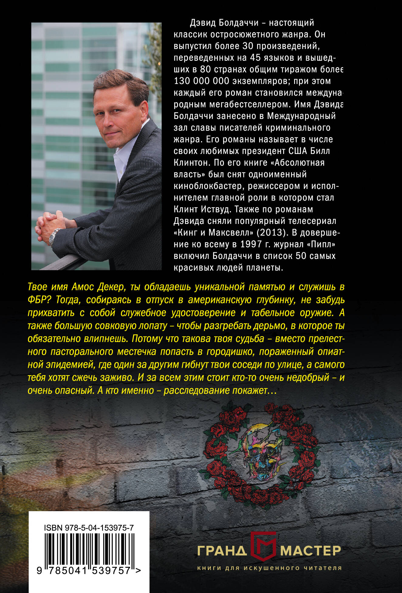 В мире продано более 130 000 000 копий романов автора Бестселлер New York Times № 1 Дэвид Болдаччи - настоящий классик остросюжетного жанра. Он выпустил более 30 произведений, переведенных более чем на 45 языков и вышедших в более чем в 80 странах общим тиражом более 130 000 000 экземпляров; при этом каждый его роман становился международным мегабестселлером. Его имя занесено в Международный зал славы писателей криминального жанра. Романы Дэвида называл в числе своих любимых президент США Билл Клинтон. По его роману «Абсолютная власть» был снят одноименный киноблокбастер, режиссером и исполнителем главной роли в котором стал Клинт Иствуд. Также по романам Дэвида был снят популярный телесериал «Кинг и Максвелл» (2013). В довершение ко всему, в 1997 г. журнал «Пипл» включил Болдаччи в список 50 самых красивых людей планеты. Жуткая травма головы, полученная на футбольном поле, не только оборвала спортивную карьеру Амоса Декера. Теперь он - обладатель абсолютной памяти, и способен запоминать буквально все, что когда-либо видел или слышал. Что ж, внезапно обретенная суперспособность пришлась как нельзя кстати для его новой работы - службы в полиции, а затем в ФБР... Твое имя Амос Декер, ты обладаешь уникальной памятью и служишь в ФБР? Тогда, собираясь в отпуск в американскую глубинку, не забудь прихватить с собой служебное удостоверение и табельное оружие. А также большую совковую лопату - чтобы разгребать дерьмо, в которое ты обязательно влипнешь. Потому что такова твоя судьба - вместо прелестного пасторального местечка попасть в городишко, пораженный опиатной эпидемией, где один за другим гибнут твои соседи по улице, а самого тебя хотят сжечь заживо. И за всем этим стоит кто-то очень недобрый - и очень опасный. А кто именно - расследование покажет… ___________________________________________________________________________________________ «Болдаччи движет весь жанр саспенса». - People «Амос Декер - один из самых необычных сыщиков в литературе, о котором мечтал бы любой писатель остросюжетного жанра». - Washington Post «И снова вы можете произнести слова «Болдаччи», «бестселлер» и «киносценарий», не переводя дыхание». - Chicago Sun «Болдаччи - мастер повествования». - Associated Press «Уже с самой первой книги читатели желают, чтобы Декер появлялся на книжных страницах снова и снова». - Kirkus Reviews| Издательство | ООО "Издательство "Эксмо" |