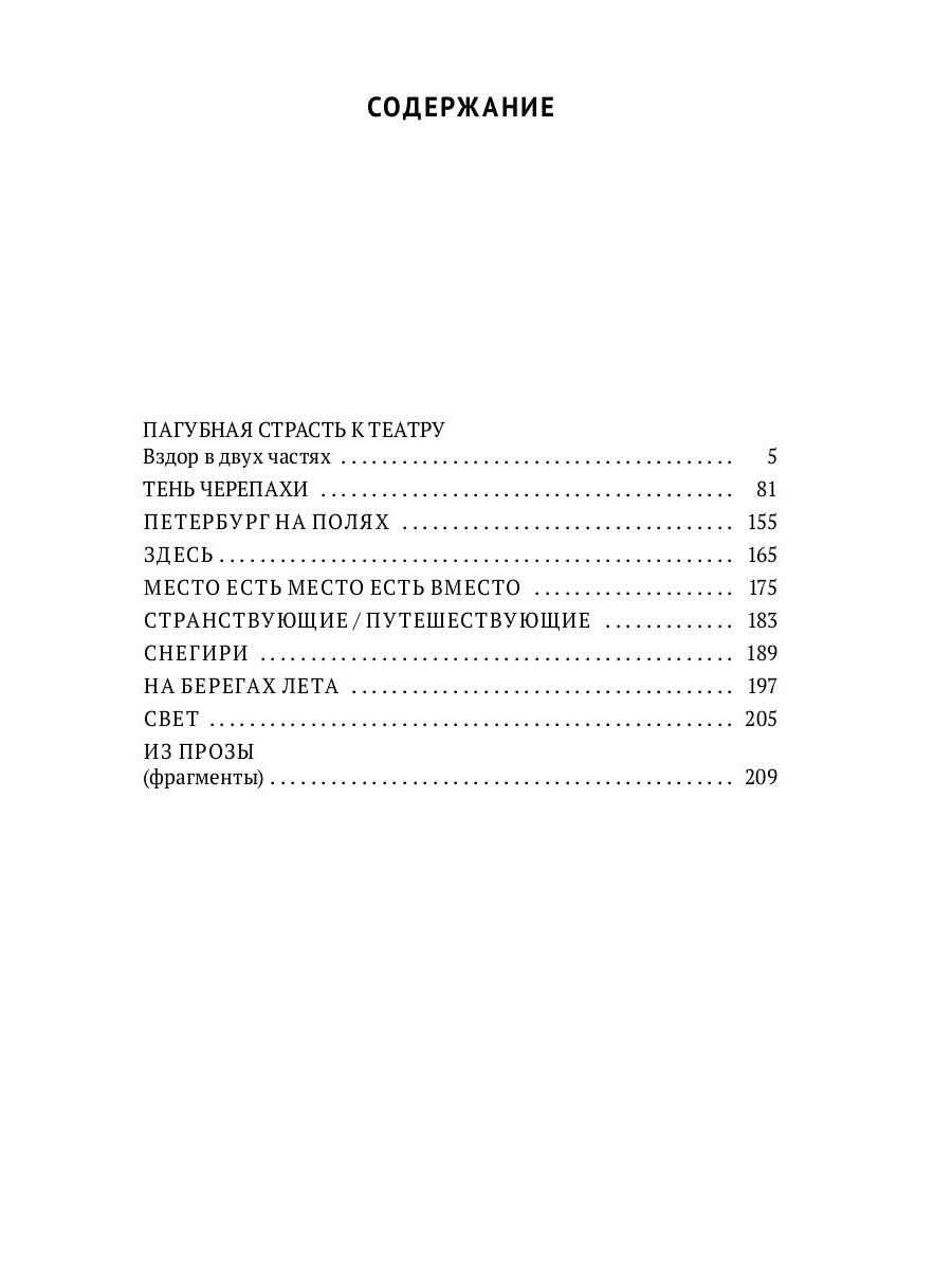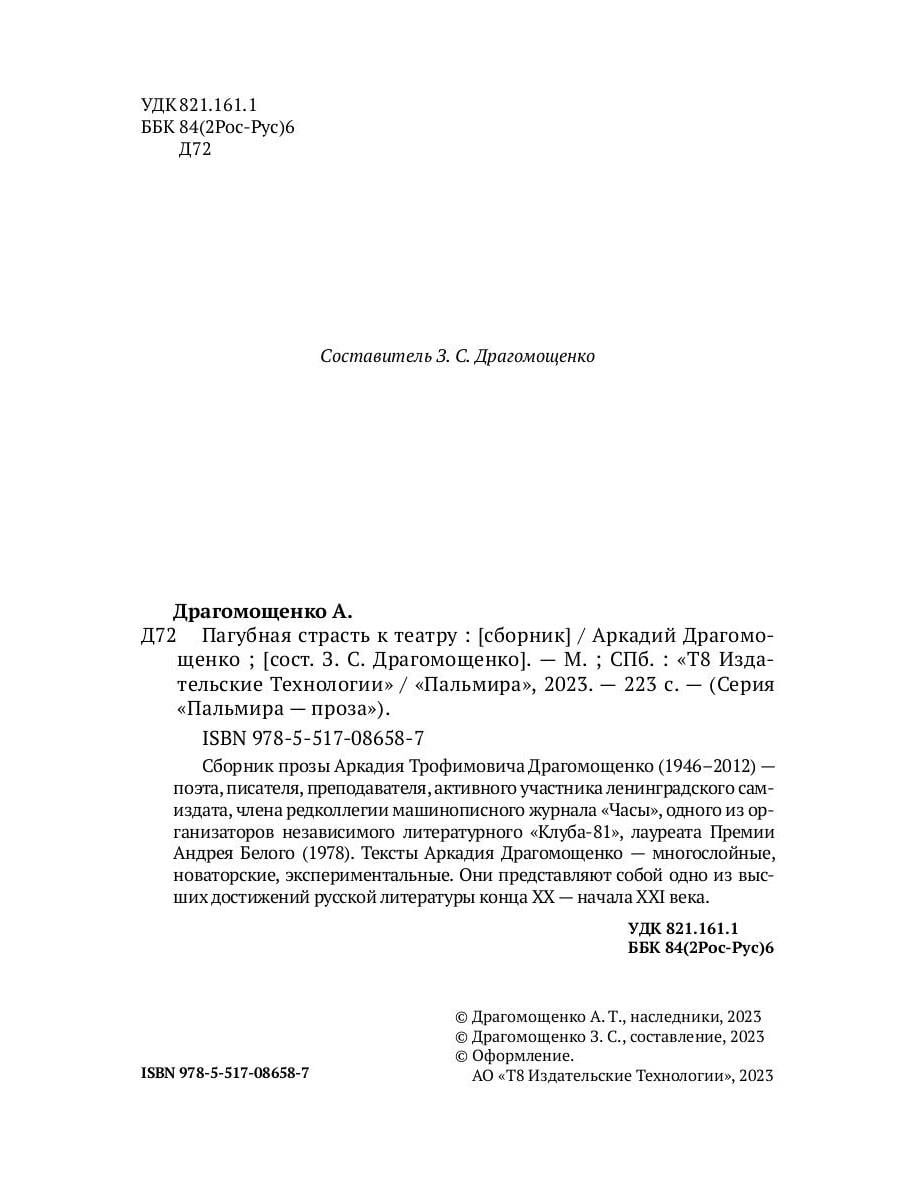 Аркадий Драгомощенко (1946-2012) - поэт и писатель, первый лауреат премии Андрея Белого за роман "Расположение в домах и деревьях". Автор книг "Китайское солнце", "Фосфор" и "Тень черепахи", а также поэтических сборников "Описание", "Тавтология", "Великое однообразие любви", "Почерк", "Остров осени" и других. Преподавал в Санкт-Петербургском государственном университете. Его участие в литературной и художественной жизни города оказывало влияние на культуру второй половины XX - начала XXI века. В сборник "Пагубная стать к театру" вошли ранние произведения автора. "Это моя пьеса. Я могу сказать еще, что там есть еще одно, для меня это было очень важное качество возникновения материала и его рост - то, что действие, поступки героев, действующих лиц, движения (даже нож взять или прореагировать на что-то) возникали из языка. То есть они придумывали на ходу себе, что делать. Потому что они лгали, а для того, чтобы подтвердить ложь, они вынуждены были как-то ее подтверждать. Возникало совершенно непонятное действие. Их вела речь, их заставляла двигаться речь. Их заставляла двигаться речь все глубже и глубже. И в конце концов какие-то реальные события, которые действительно возможны были бы в этом, отодвигаются в сторону, и возникает совершенно гротескнейшая ситуация, когда люди говорят: "У тебя выросли уши ослиные". Раз - а у него у самого выросли уши ослиные." Аркадий Драгомощенко| Издательство | Т8 RUGRAM |
