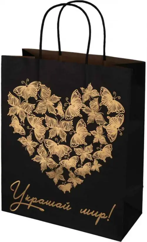 Черный крафт-пакет - стильное и смелое решение. Это показатель стремления к эксклюзивности, премиальности и, в то же время, экологичности. Украшает наши эксклюзивные подарочные пакеты из черного крафта металлизированное и голографическое тиснение, которое сияет и переливается под солнечными лучами. Пакеты идеально подойдут для размещения внутри сувениров, интерьерных украшений, картин среднего размера, мягких игрушек и многого другого. Ручки выполнены из крученого бумажного шпагата, а дно дополнительно укреплено картоном.