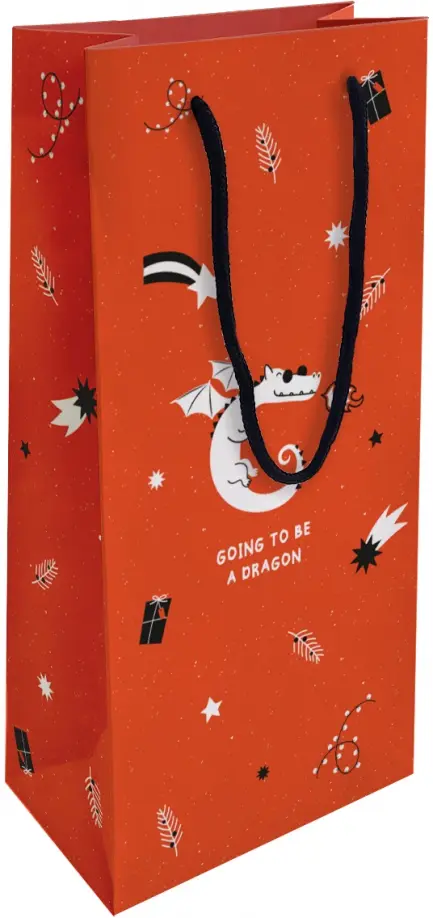 Пакет подарочный с подгибкой, с веревочными ручками. Пакет из картона 200 г/м2 с матовой ламинацией. Размер пакета 15*32 см с глубиной 8 см. Грузоподъемость 2-3 кг. Тематика: НГ.