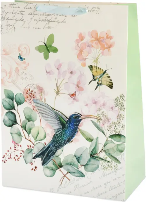 Выполнен из плотной бумаги 210 г/кв.м, для удобной переноски на пакете имеются две ручки из атласной ленты.